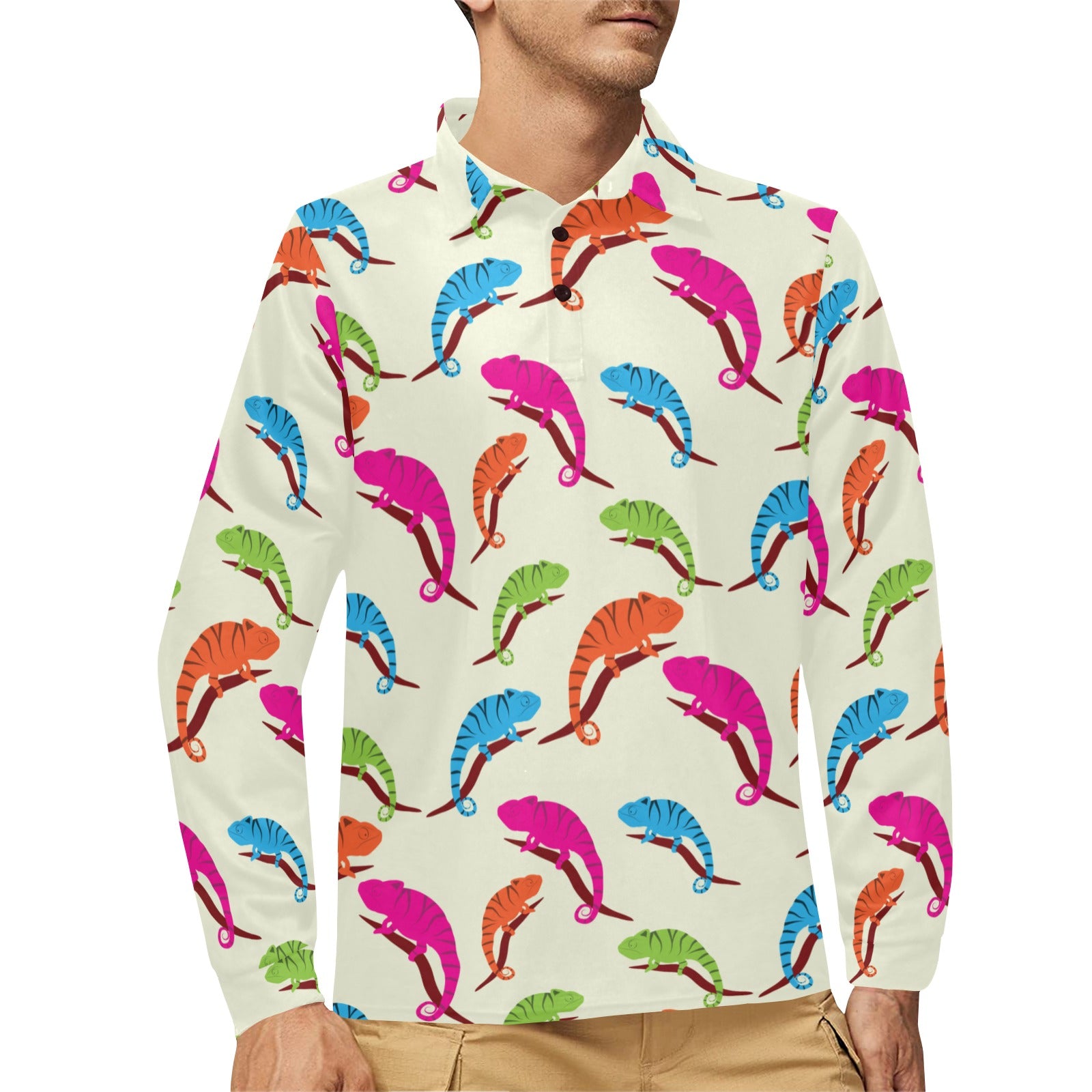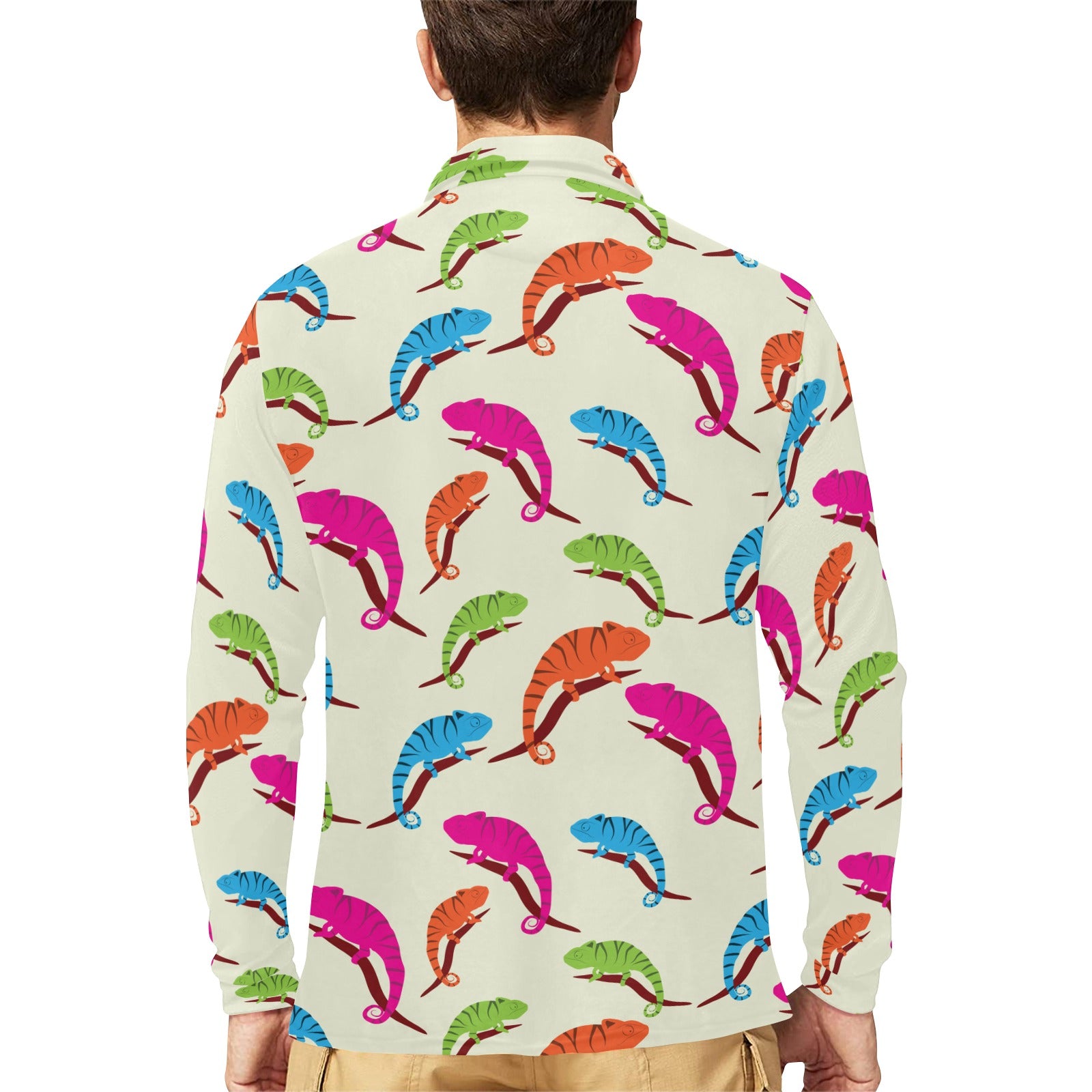Colorful Chameleon lizard pattern Men's Long Sleeve Polo Shirt
