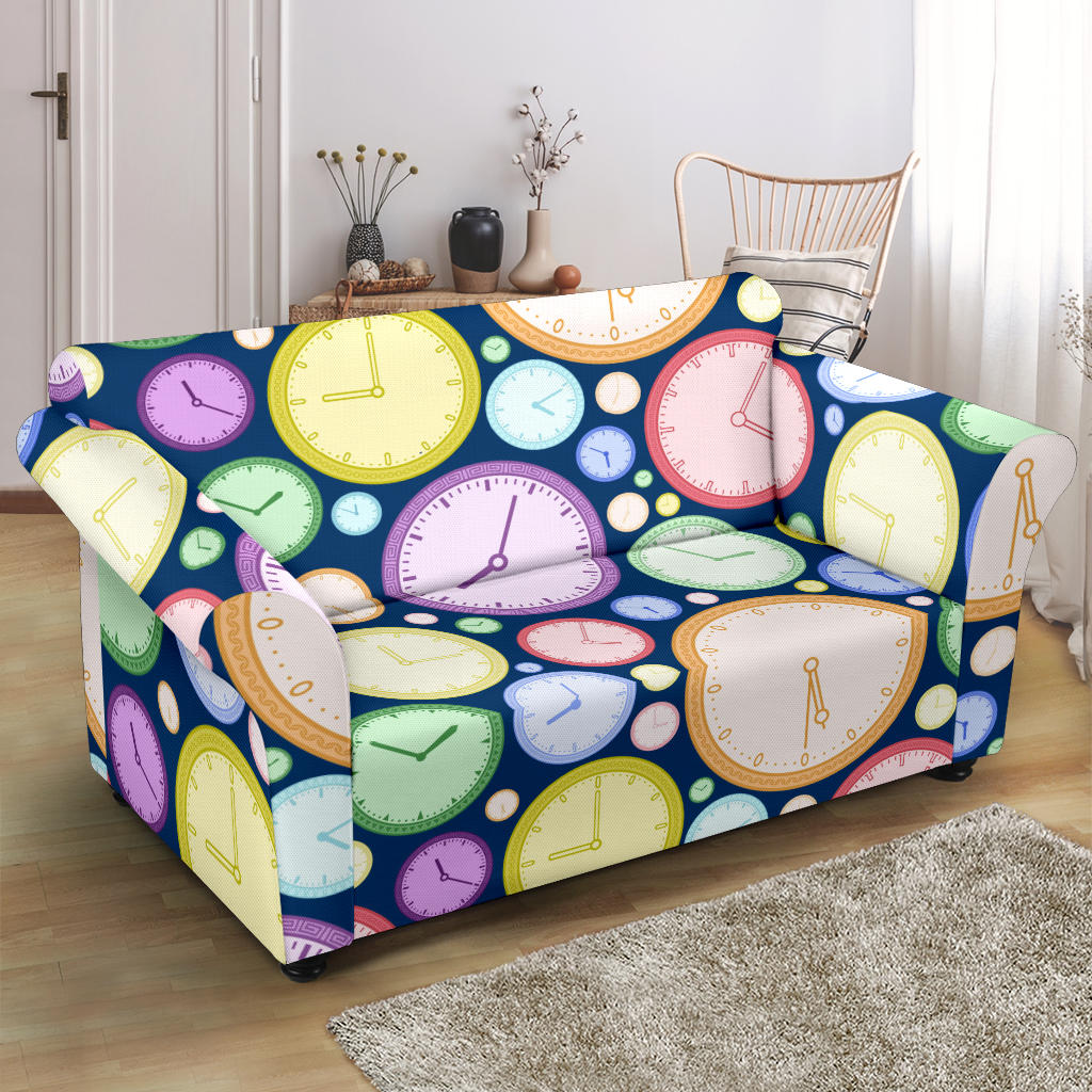 Colorful clock background Loveseat Sofa Slipcover is a uniqued design and limited item. It made to order, hand printed, and sewn with love in our factory.