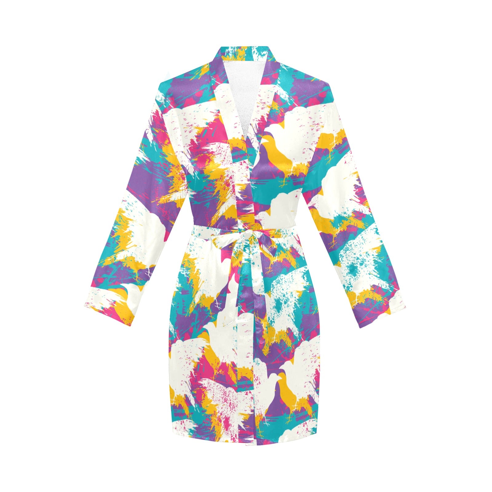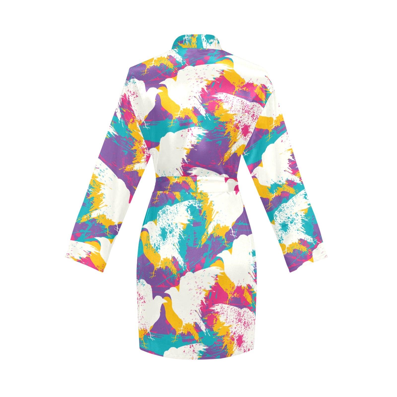 Colorful crow illustration pattern Women's Long Sleeve Belted Night Robe