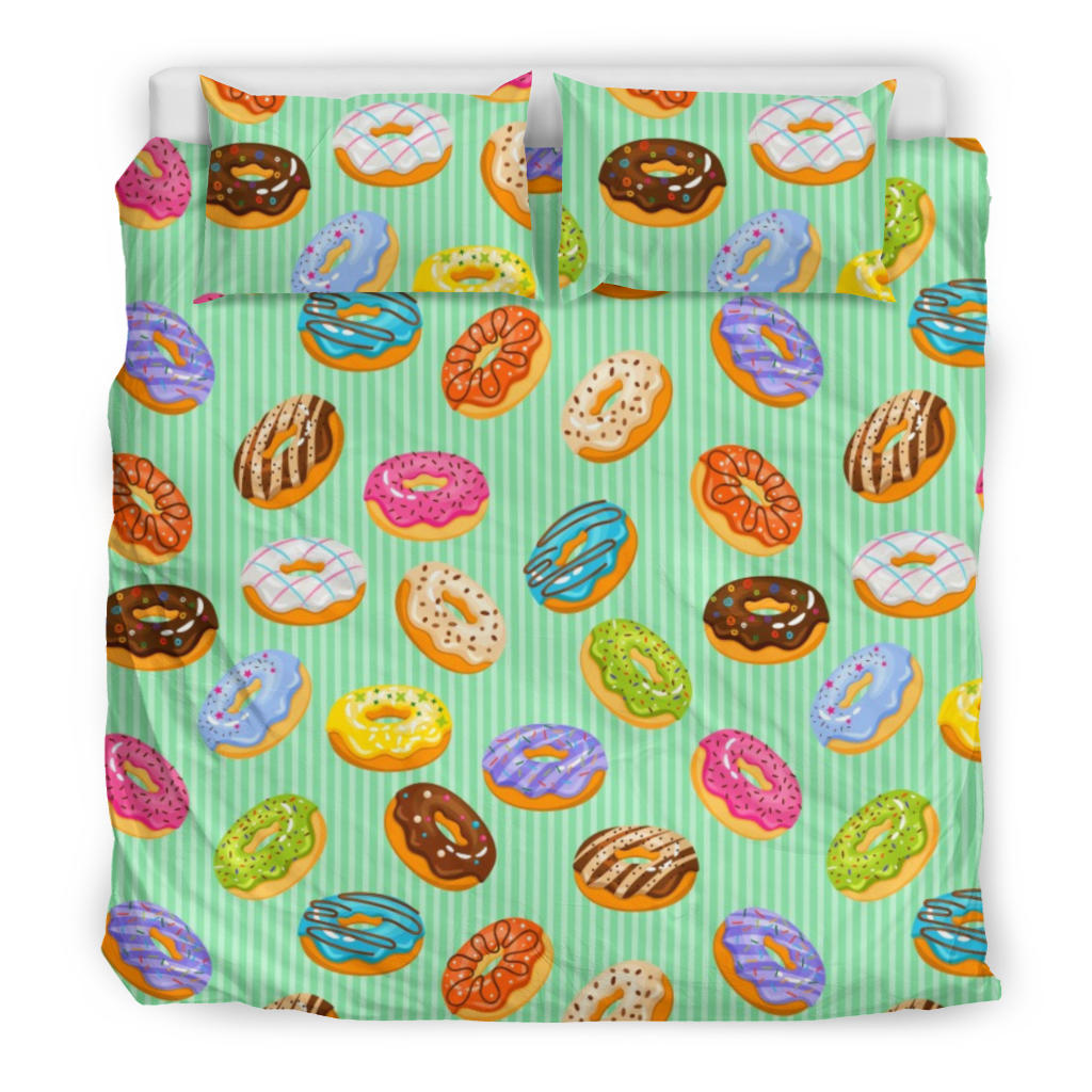 Colorful donut pattern green background Bedding Set is a uniqued design and limited item. It made to order, hand printed, and sewn with love in our factory.