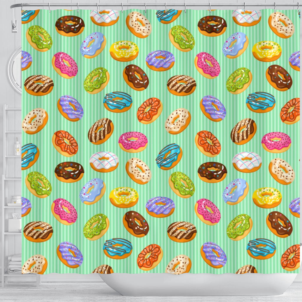 Colorful donut pattern green background Shower Curtain is a uniqued design and limited item. It made to order, hand printed, and sewn with love in our factory.