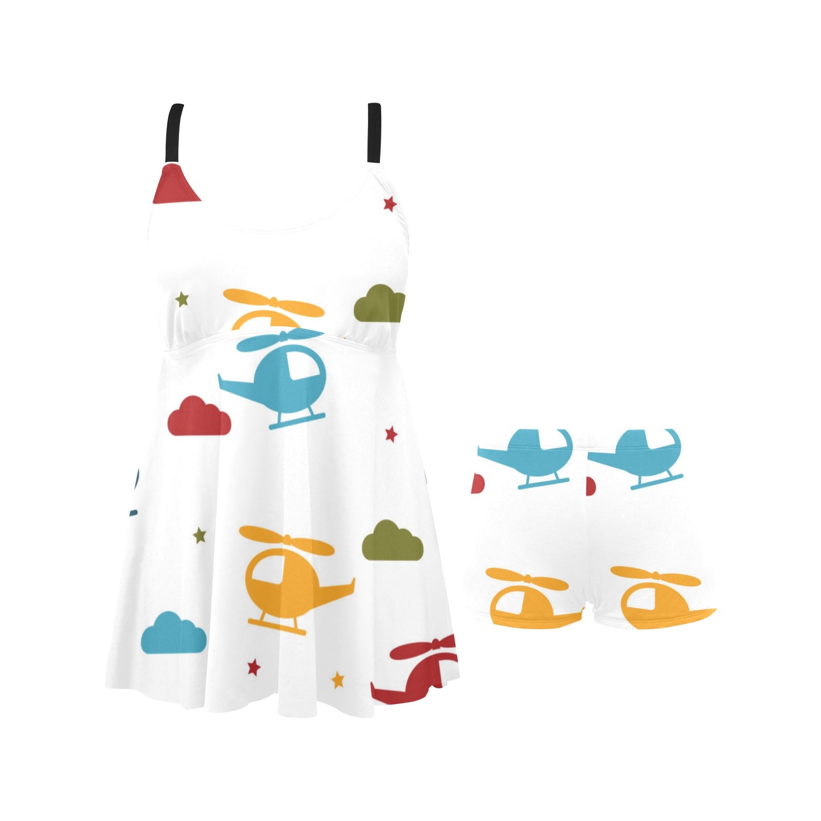 Colorful helicopter pattern Chest Sexy Pleated Two Piece Swim Dress