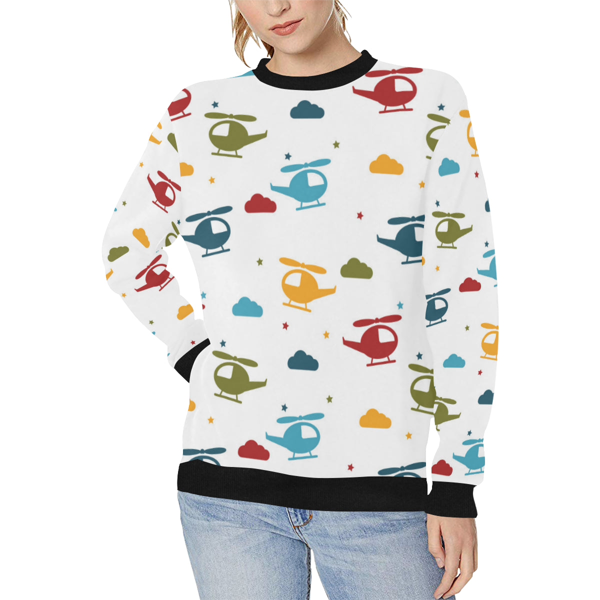 Colorful helicopter pattern Women's Crew Neck Sweatshirt is a uniqued design and limited item. It made to order, hand printed, and sewn with love in our factory.