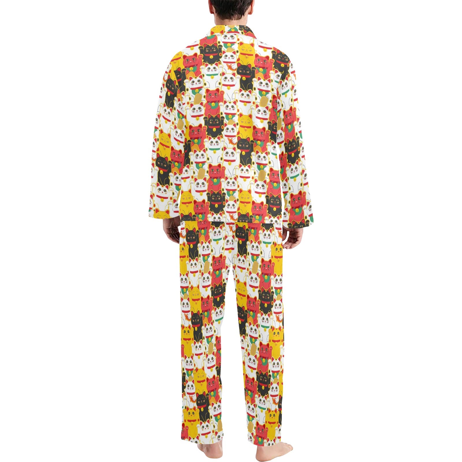 Colorful Maneki neko cat pattern Men's Long Pajama Set