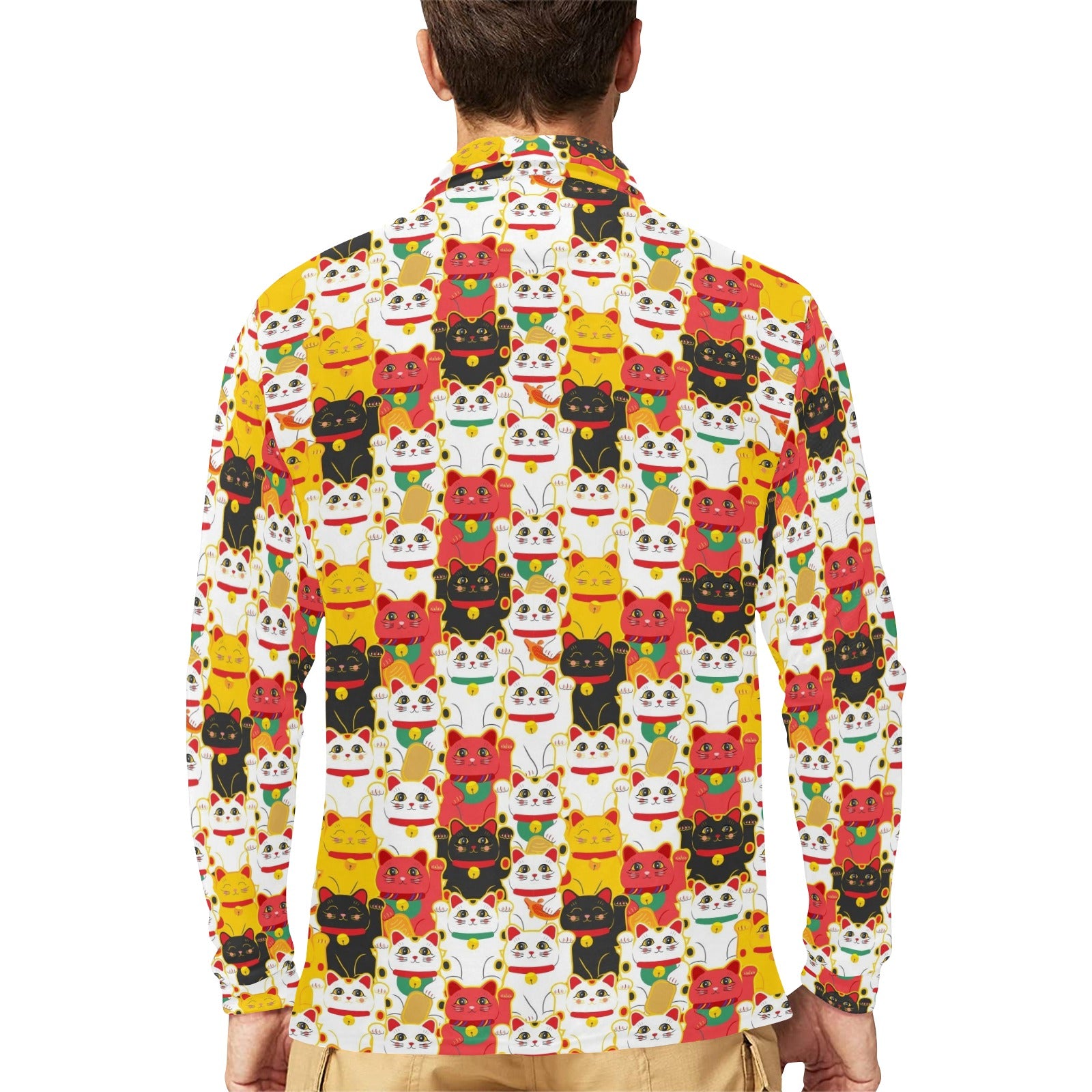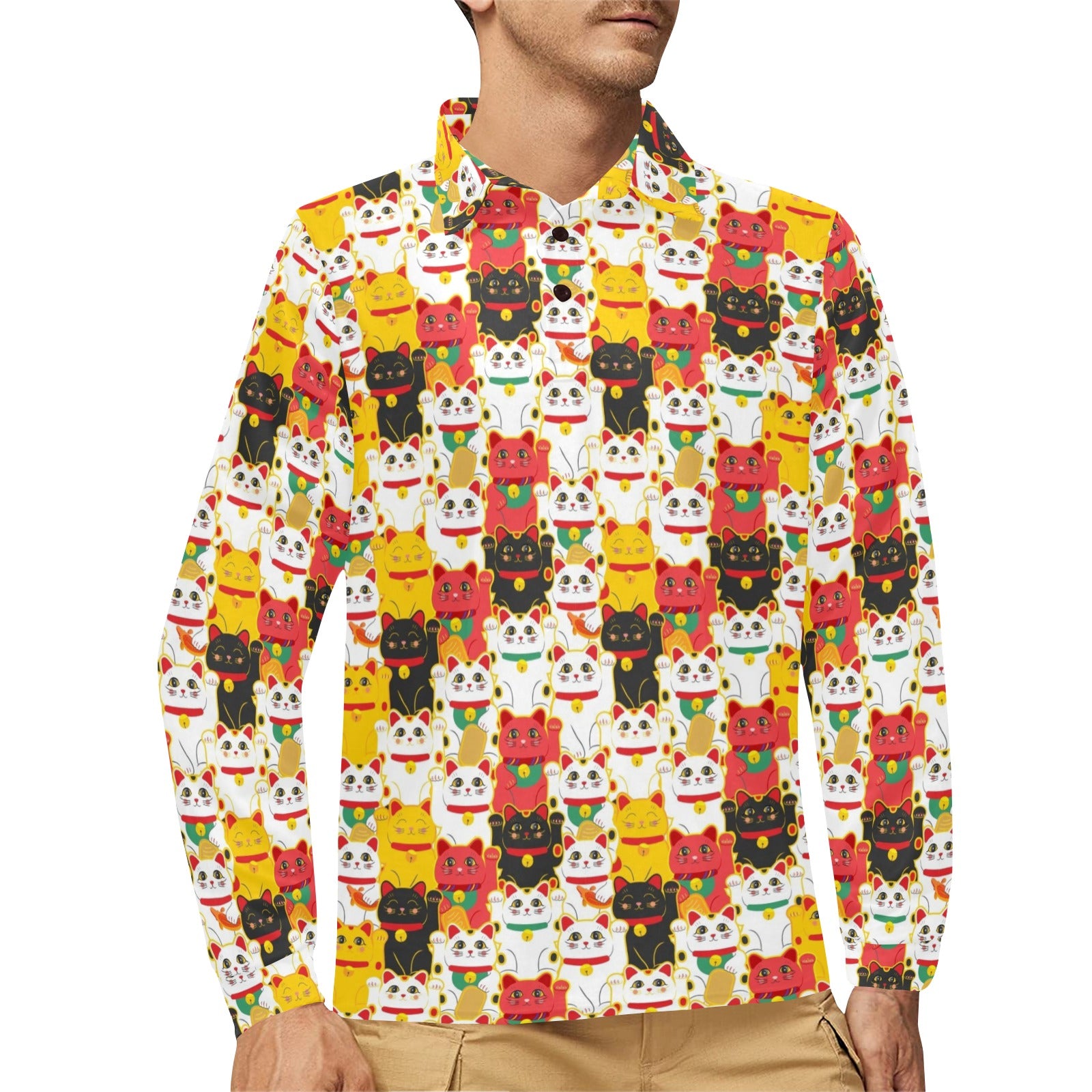 Colorful Maneki neko cat pattern Men's Long Sleeve Polo Shirt
