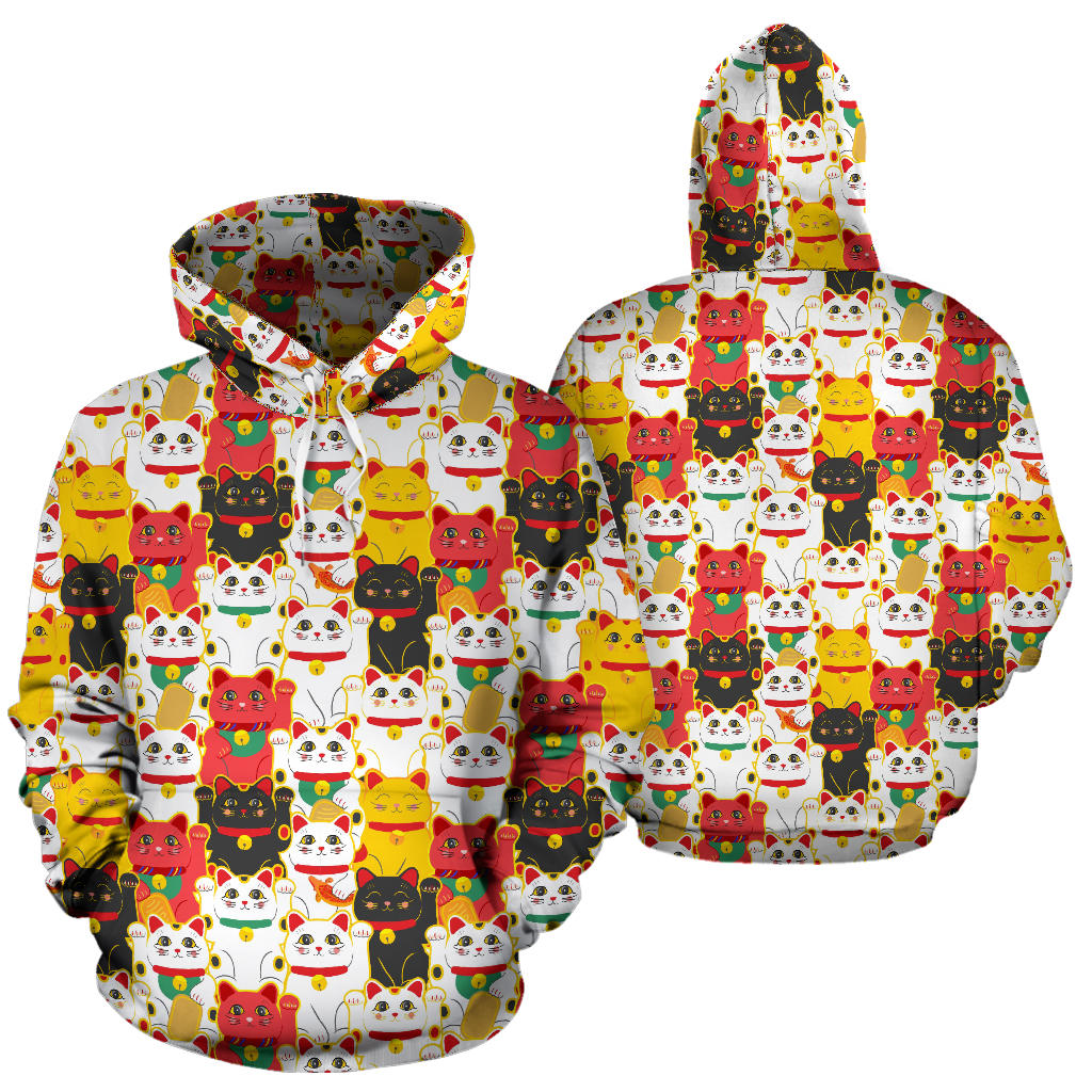 Colorful Maneki Neko Lucky Cat Pattern Men Women Pullover Hoodie