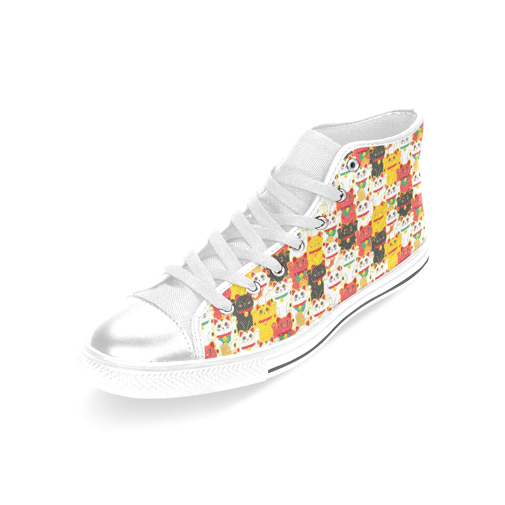 Colorful Maneki neko cat pattern Women's High Top Canvas Shoes White