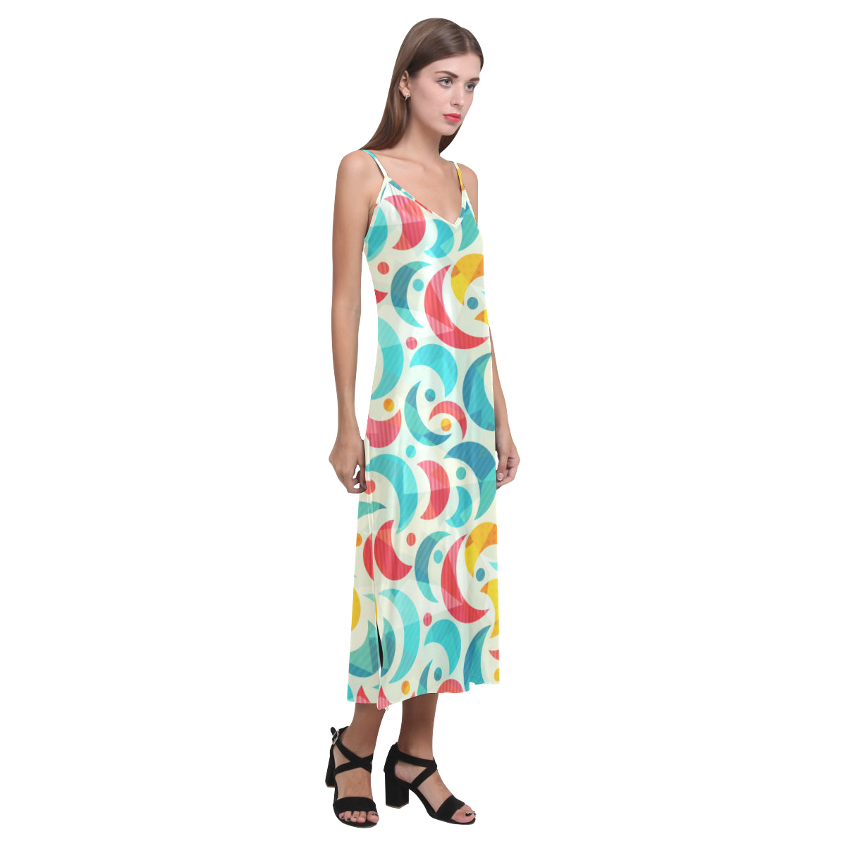 Colorful moon pattern V-Neck Open Fork Long Dress is a uniqued design and limited item. It made to order, hand printed, and sewn with love in our factory.