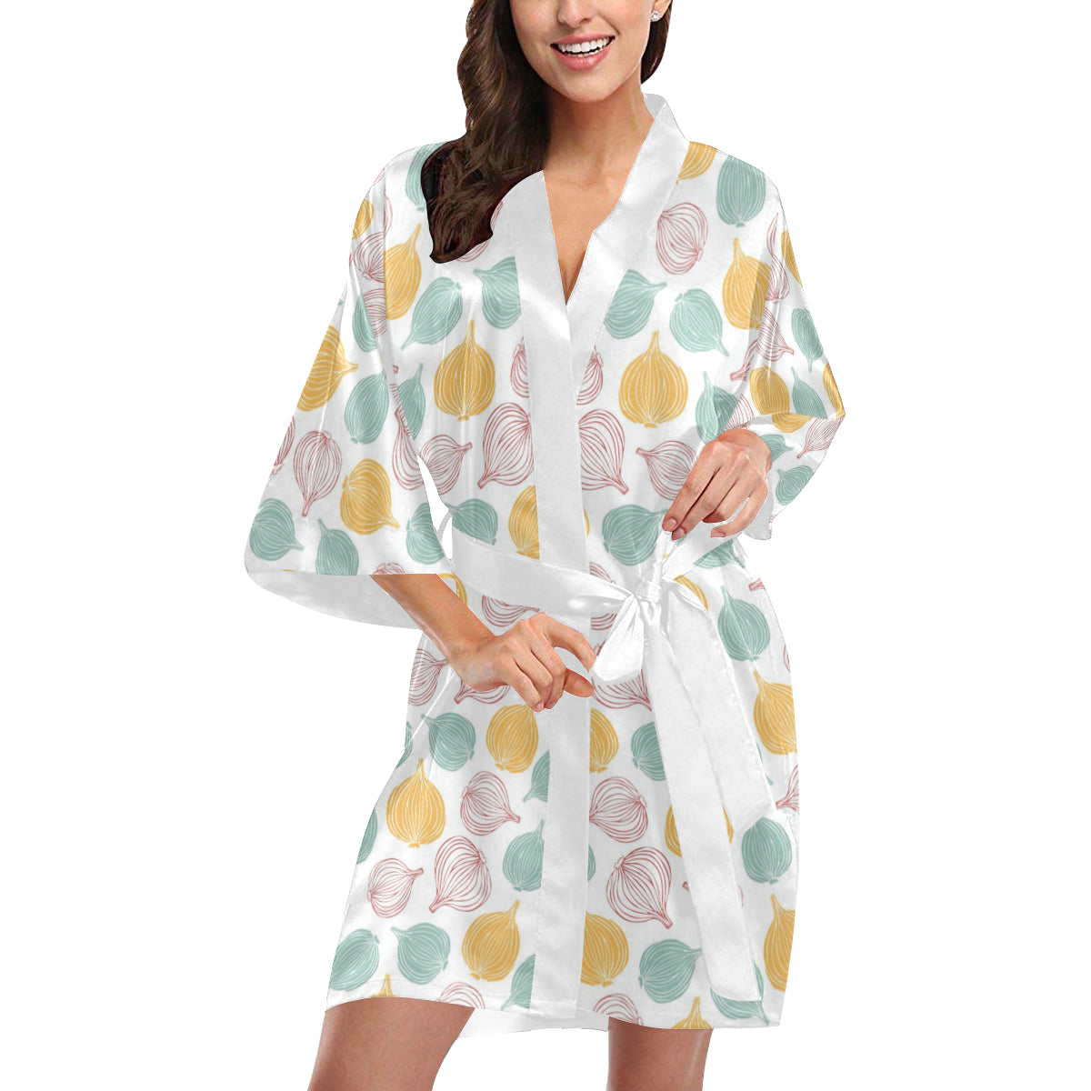 colorful onions white background Women's Short Kimono Robe is a uniqued design and limited item. It made to order, hand printed, and sewn with love in our factory.
