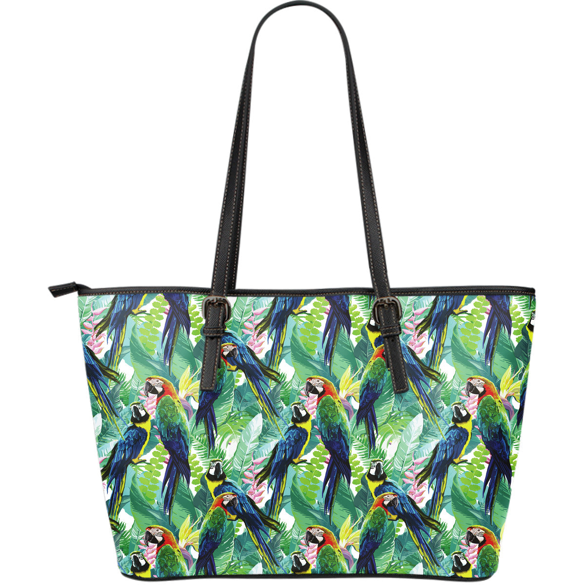 Colorful parrot exotic flower leaves Large Leather Tote Bag is a uniqued design and limited item. It made to order, hand printed, and sewn with love in our factory.