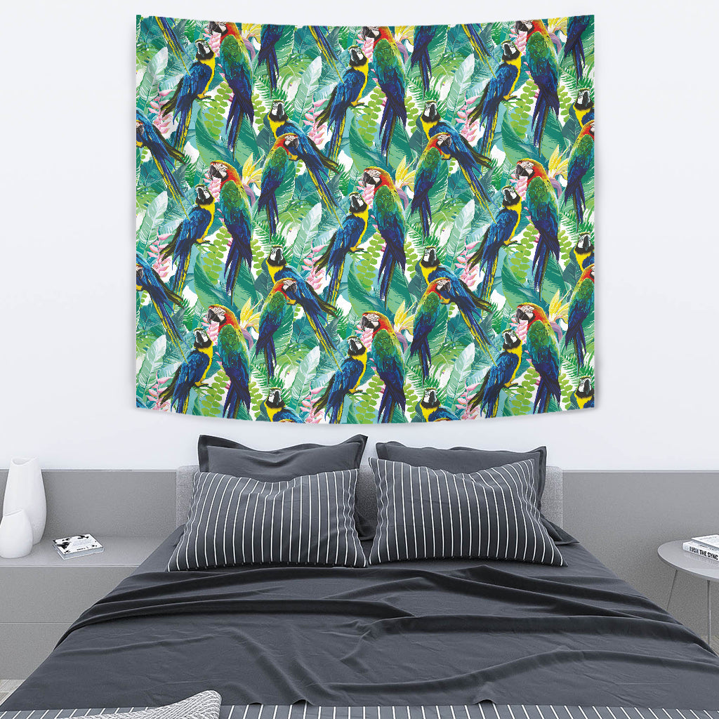Colorful Parrot Exotic Flower Leaves Wall Tapestry