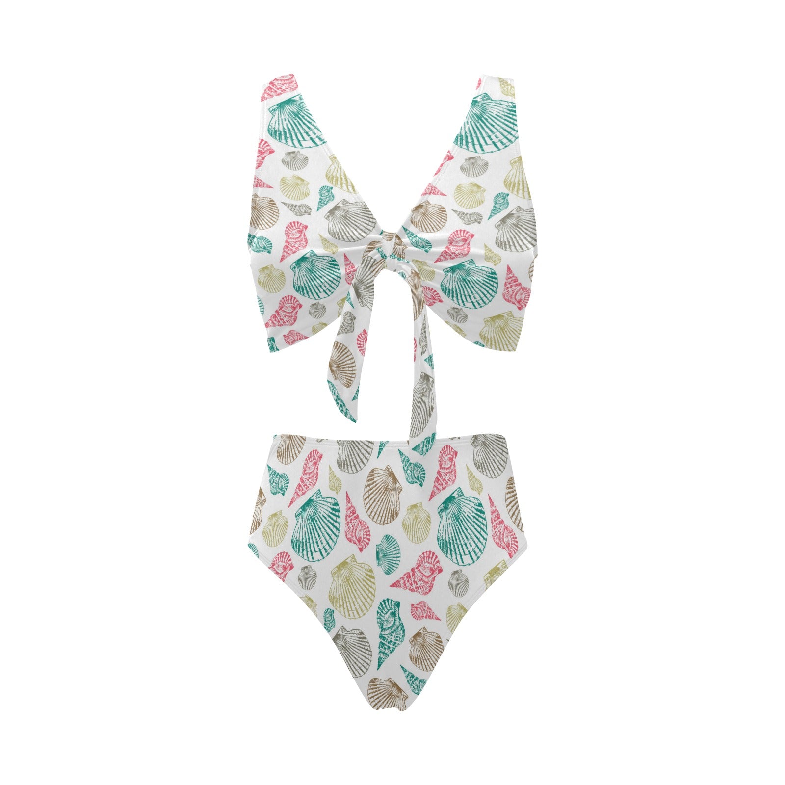 Colorful shell pattern Chest Bowknot High Waisted Bikini Swimsuit