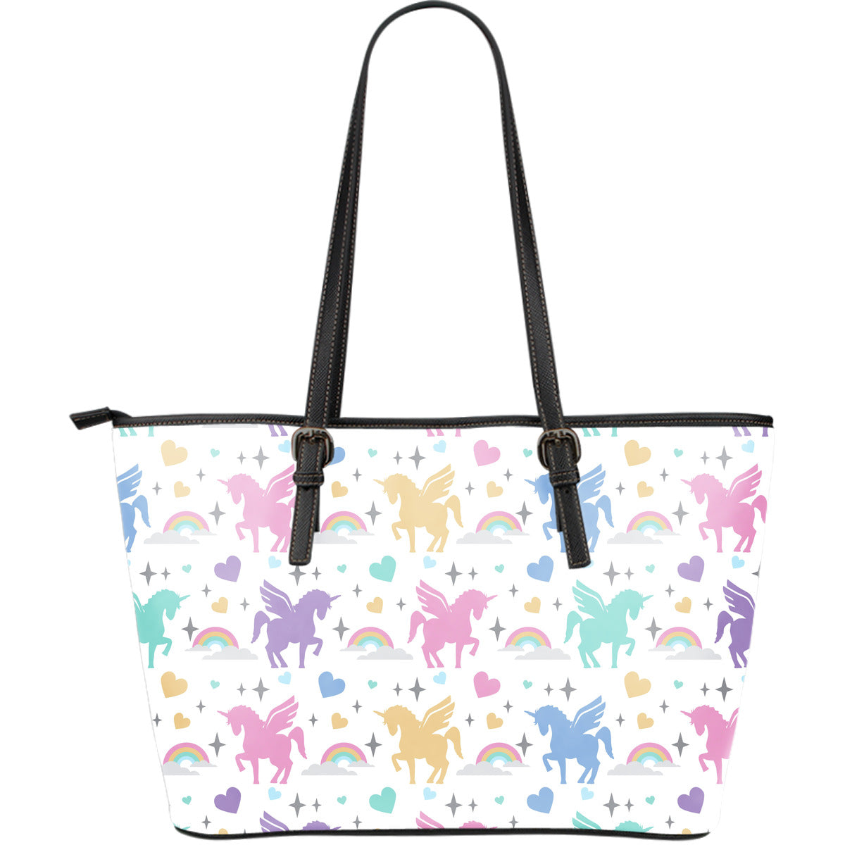 colorful unicorn rainbow heart pattern Large Leather Tote Bag is a uniqued design and limited item. It made to order, hand printed, and sewn with love in our factory.