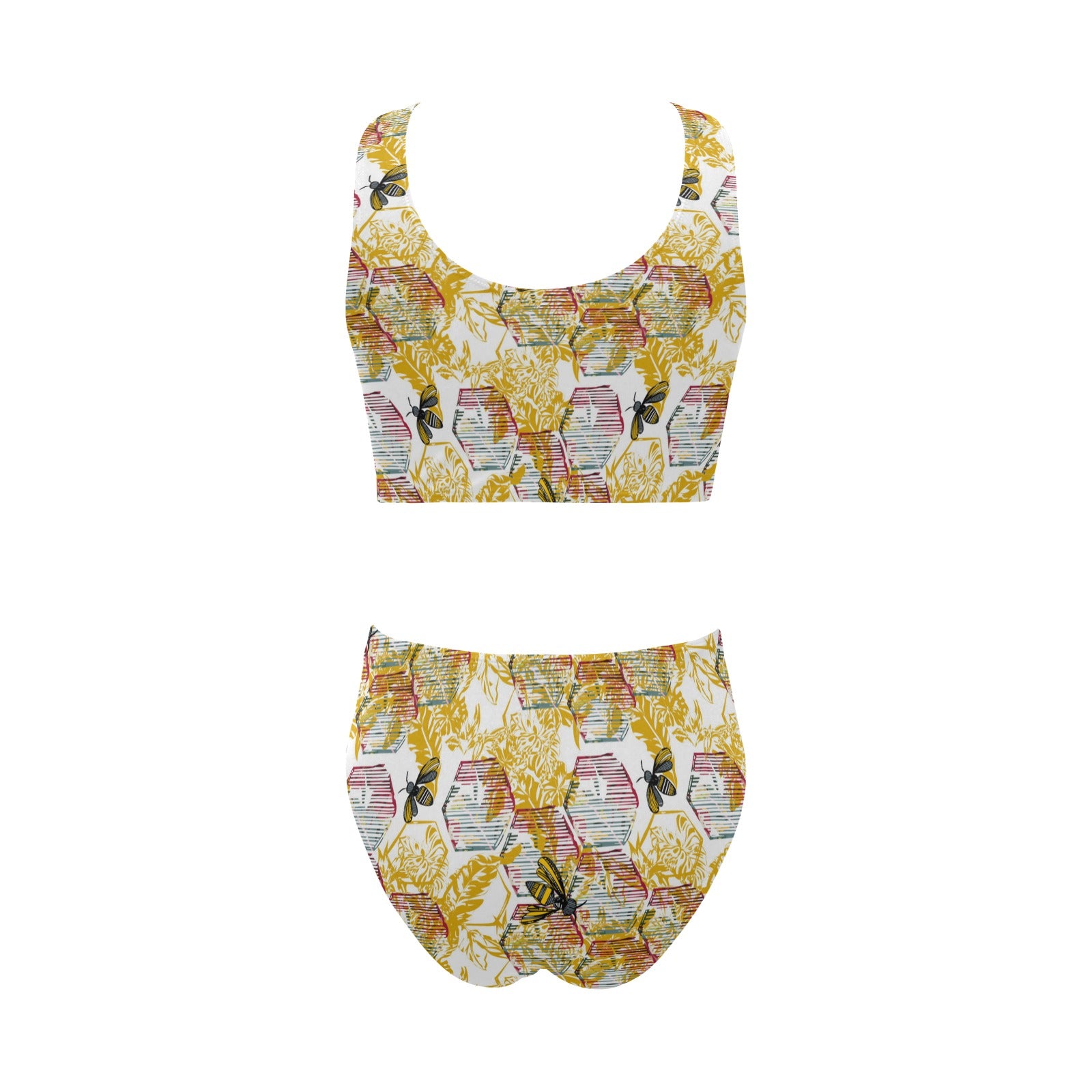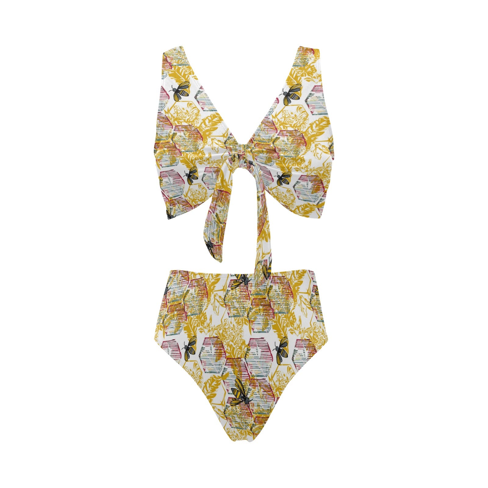 Cool Bee honeycomb leaves pattern Chest Bowknot High Waisted Bikini Swimsuit