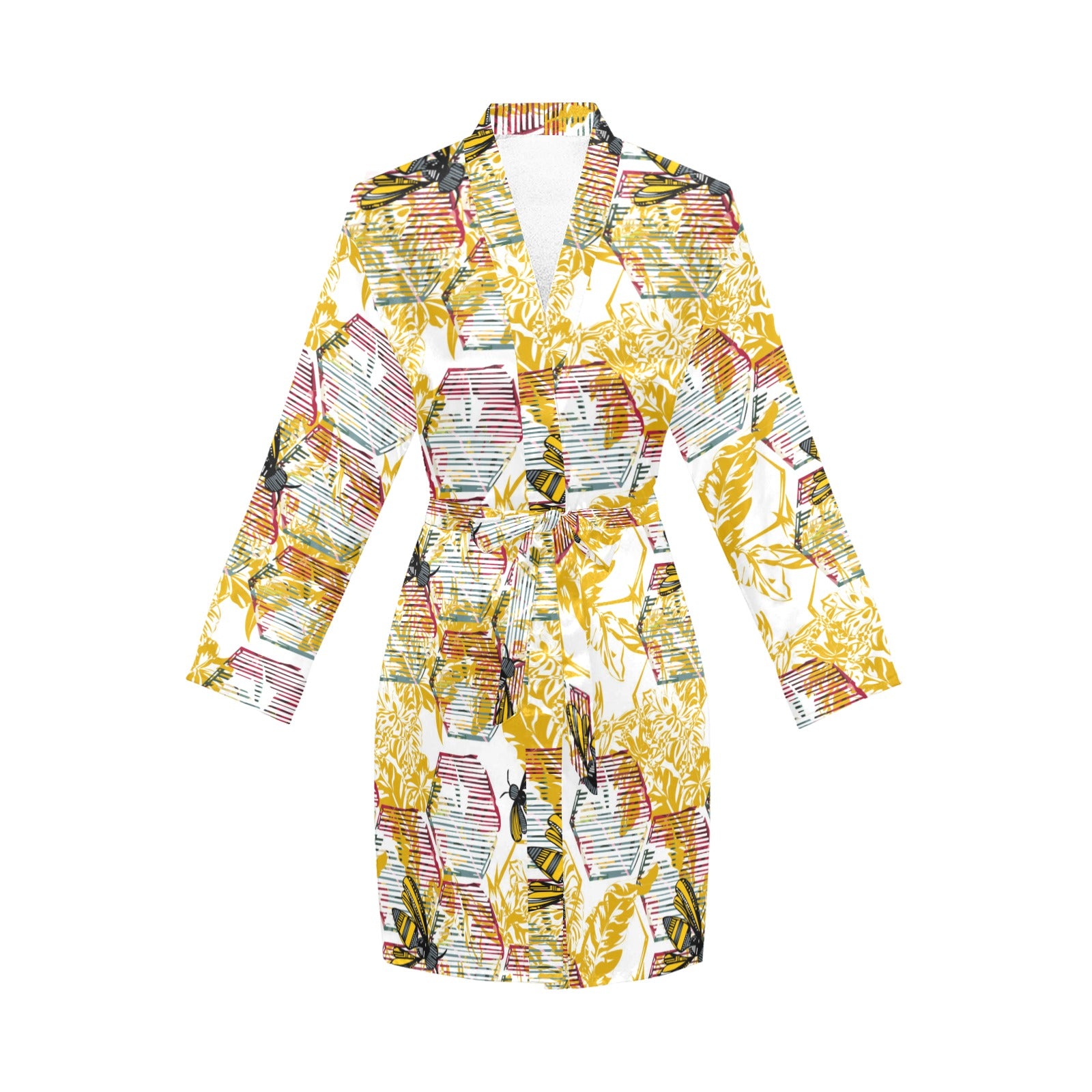 Cool Bee honeycomb leaves pattern Women's Long Sleeve Belted Night Robe