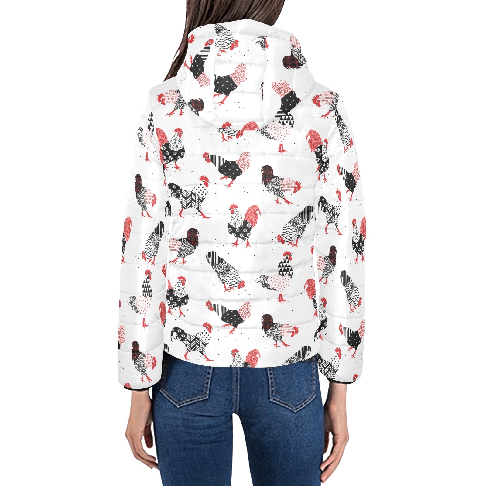 Cool rooster chicken cock floral ornament backgrou Women's Padded Hooded Jacket