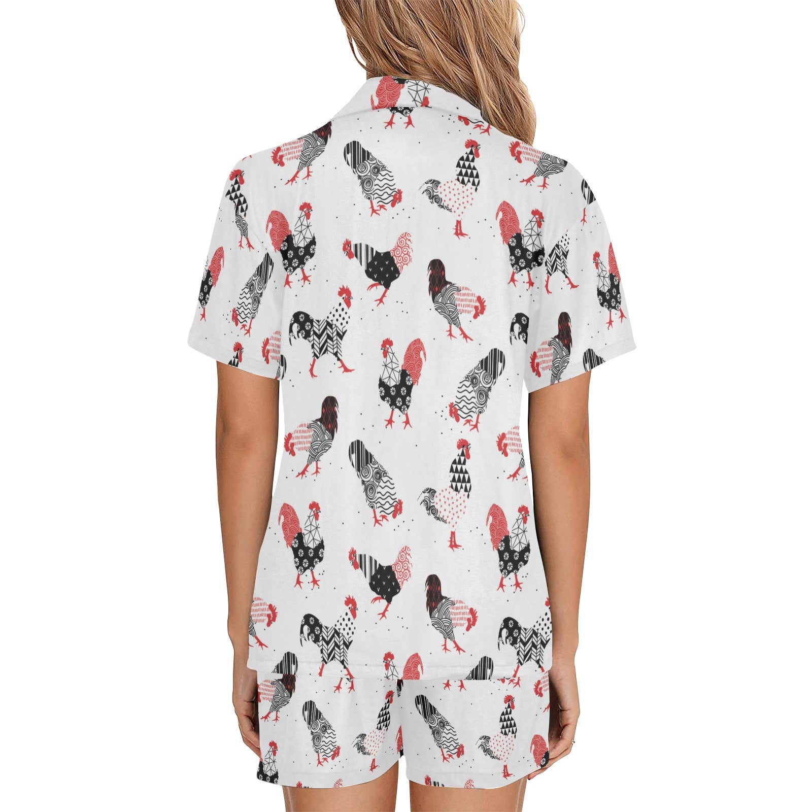 Cool rooster chicken cock floral ornament backgrou Women's V-Neck Short Pajama Set