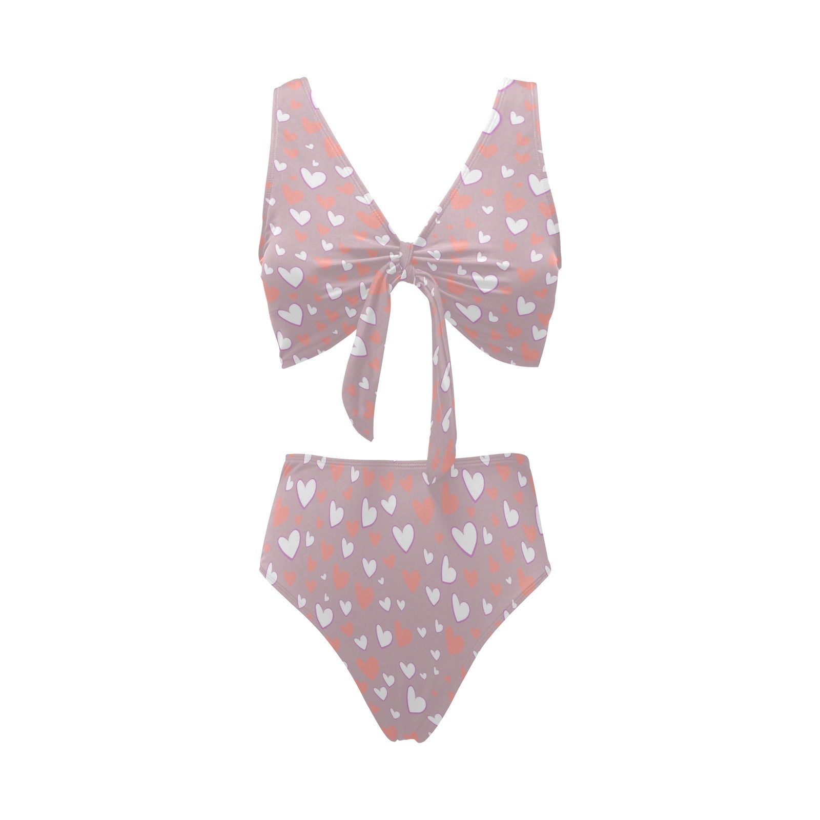 coral white heart pattern Chest Bowknot High Waisted Bikini Swimsuit