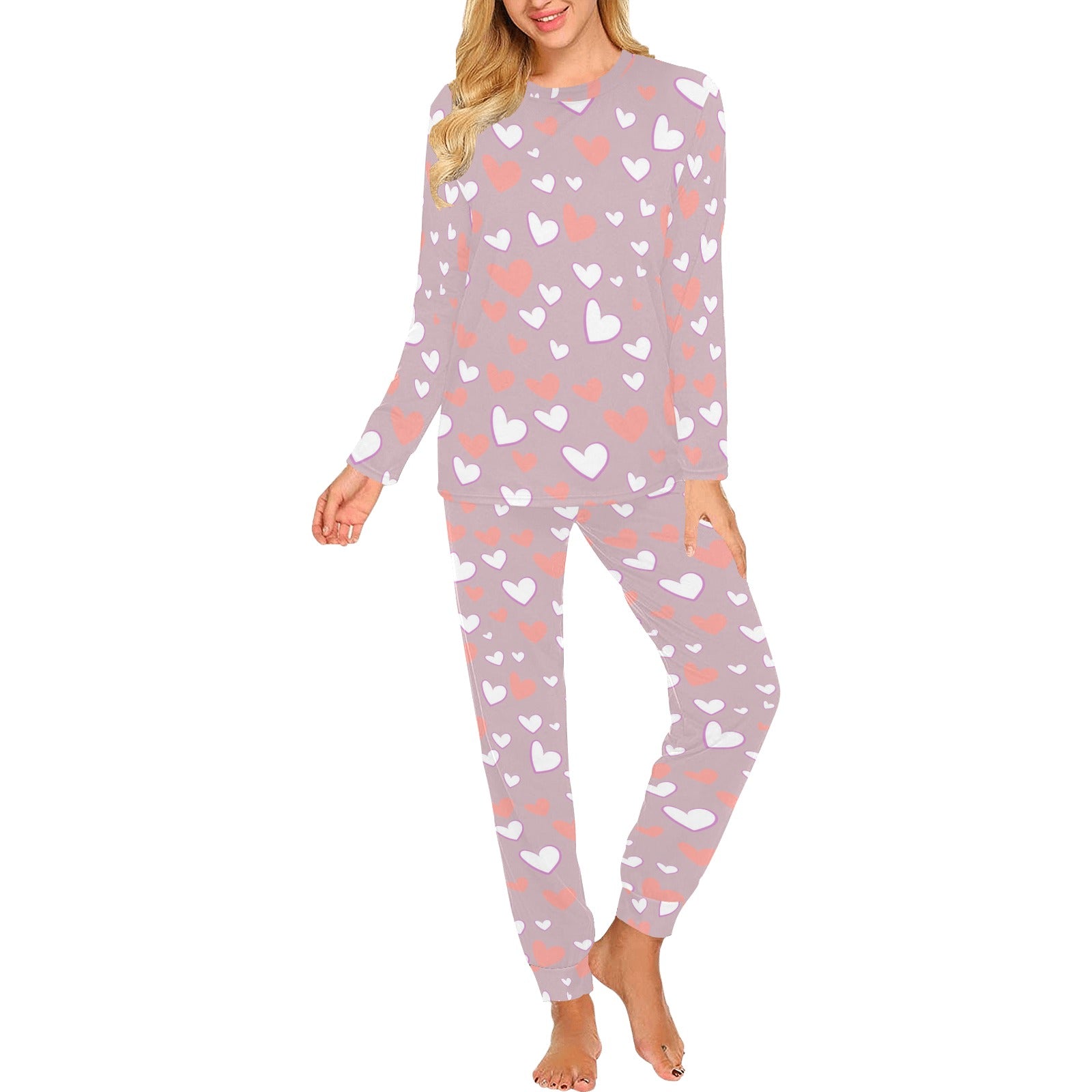coral white heart pattern Women's All Over Print Pajama Set
