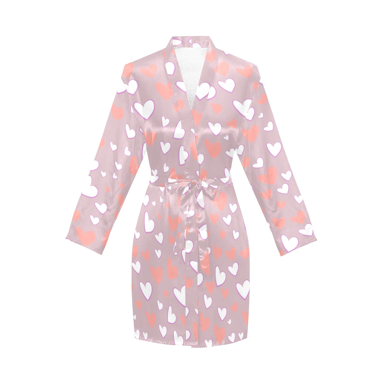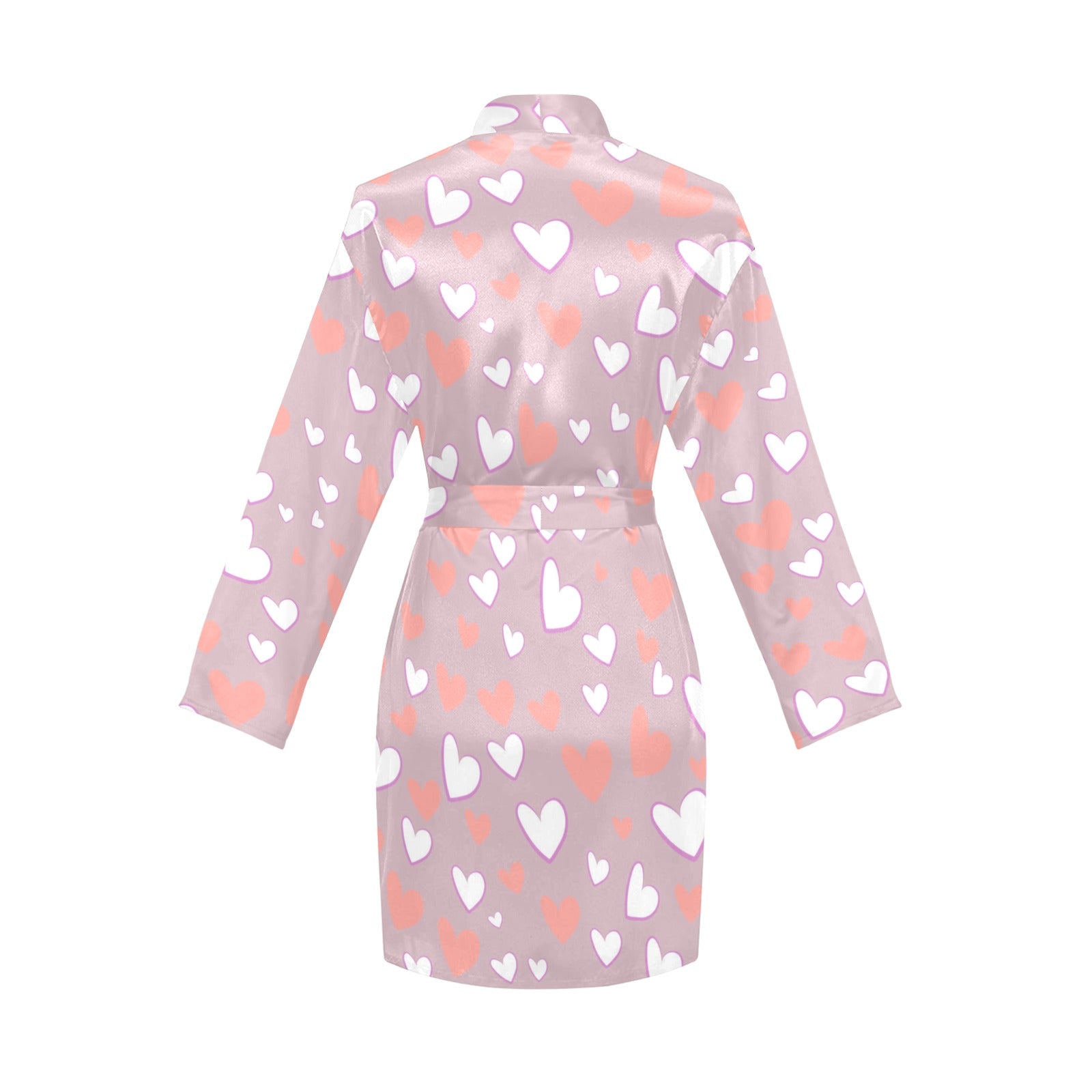 coral white heart pattern Women's Long Sleeve Belted Night Robe
