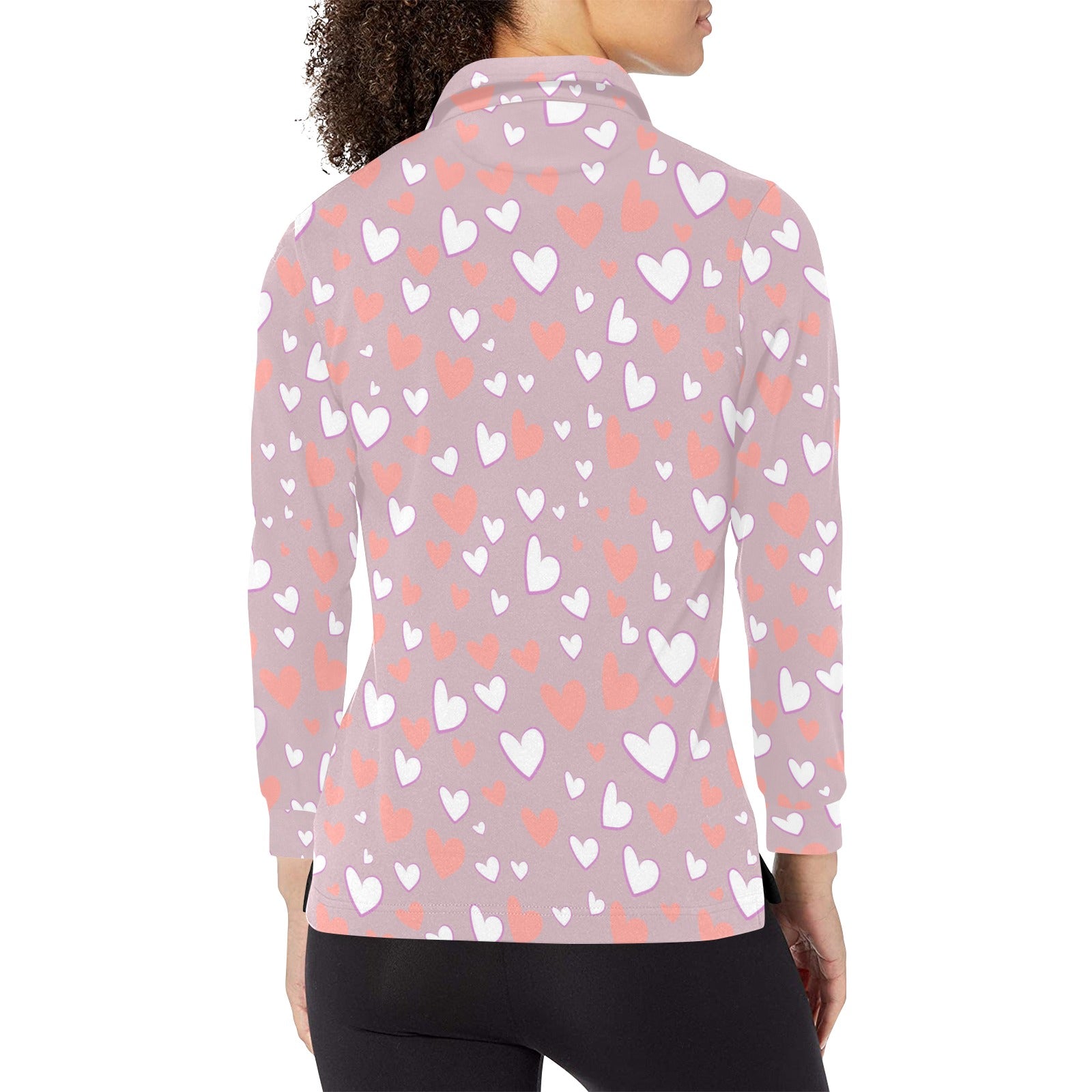 coral white heart pattern Women's Long Sleeve Polo Shirt