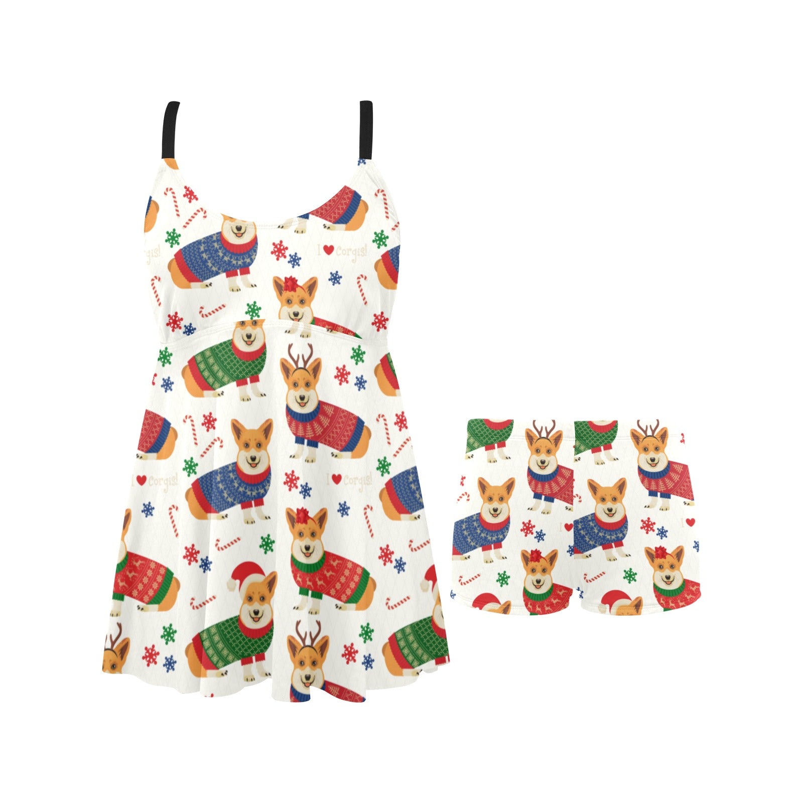 Corgi Christmas Pattern Chest Sexy Pleated Two Piece Swim Dress