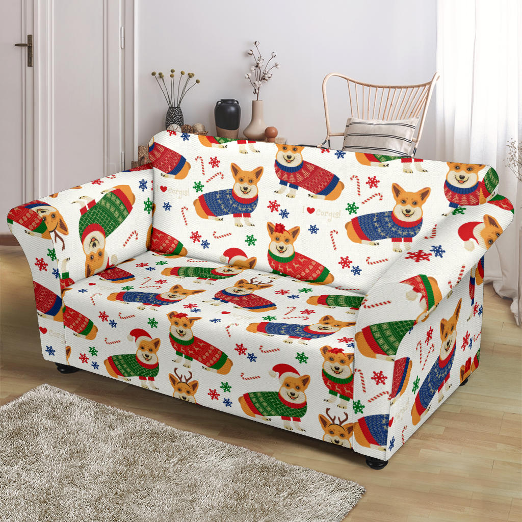 Corgi Christmas Pattern Loveseat Couch Slipcover