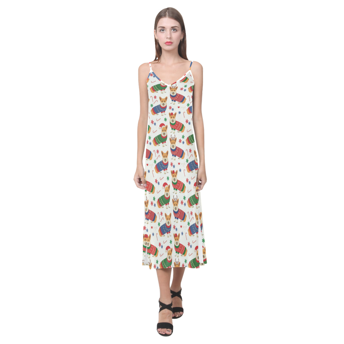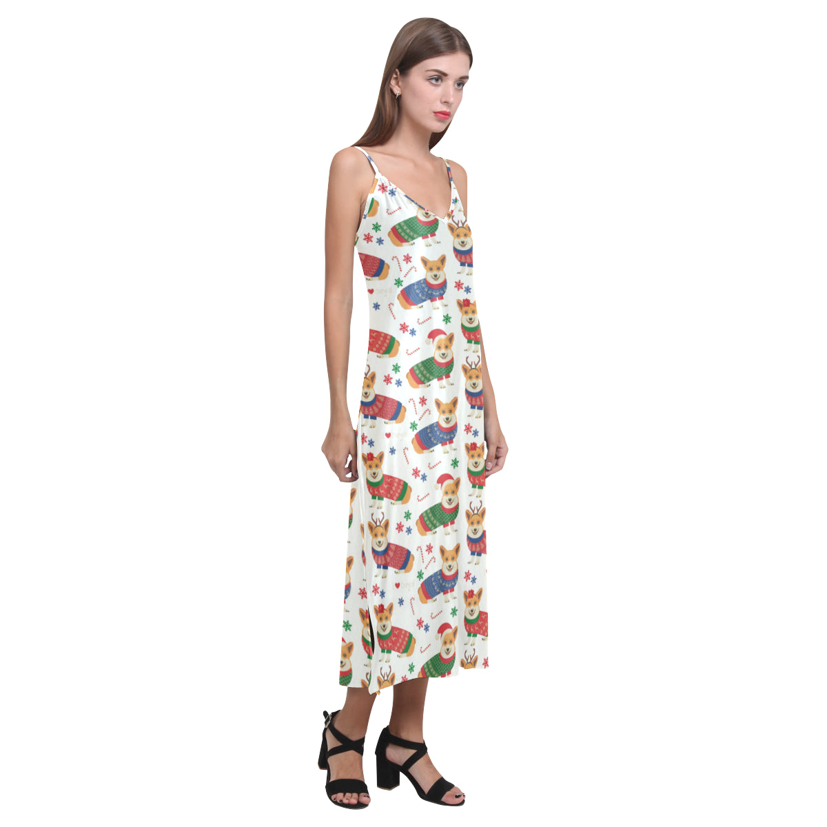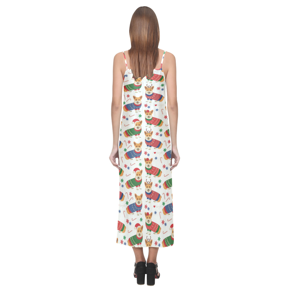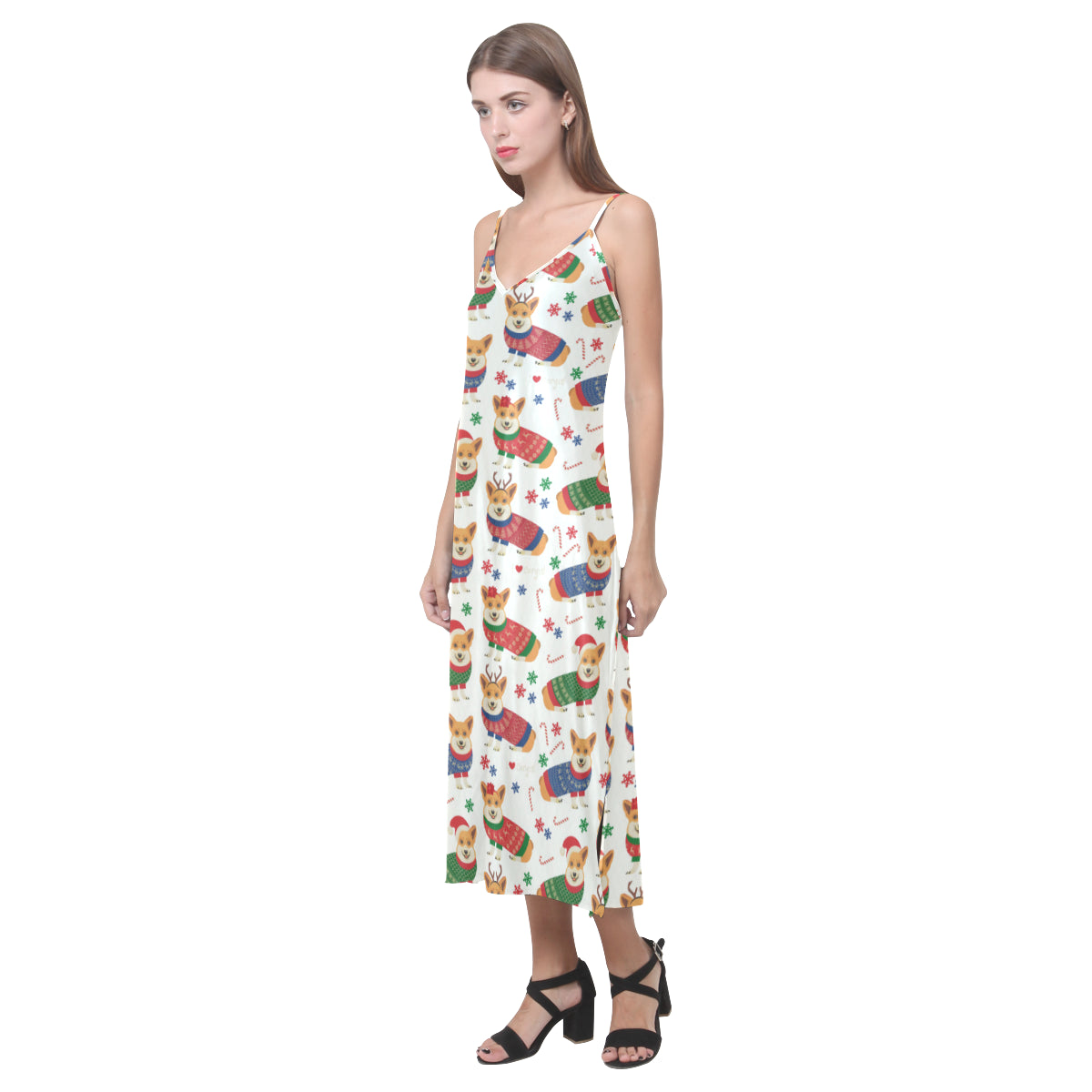 Corgi Christmas Pattern V-Neck Open Fork Long Dress