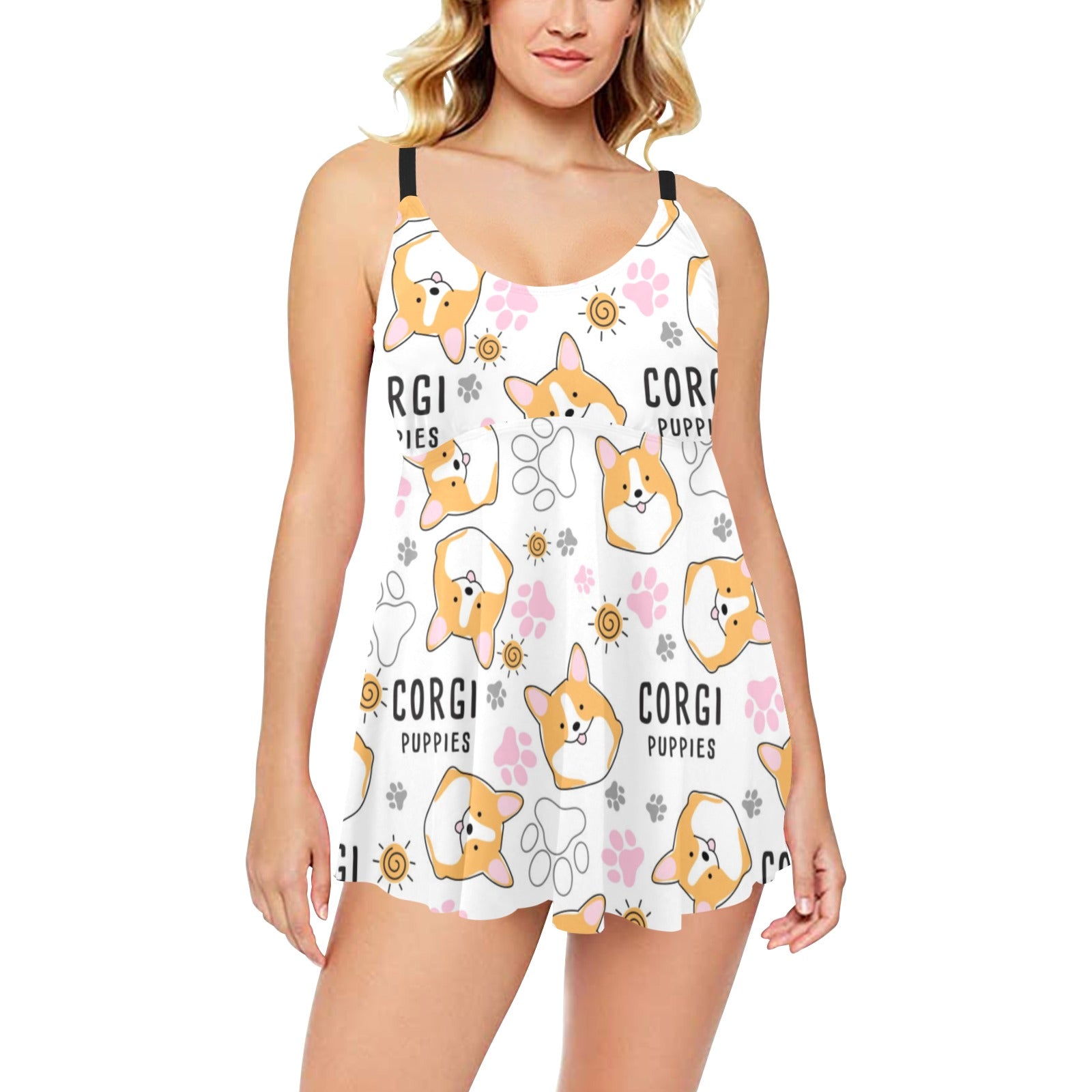 Corgi Dog Pattern Chest Sexy Pleated Two Piece Swim Dress