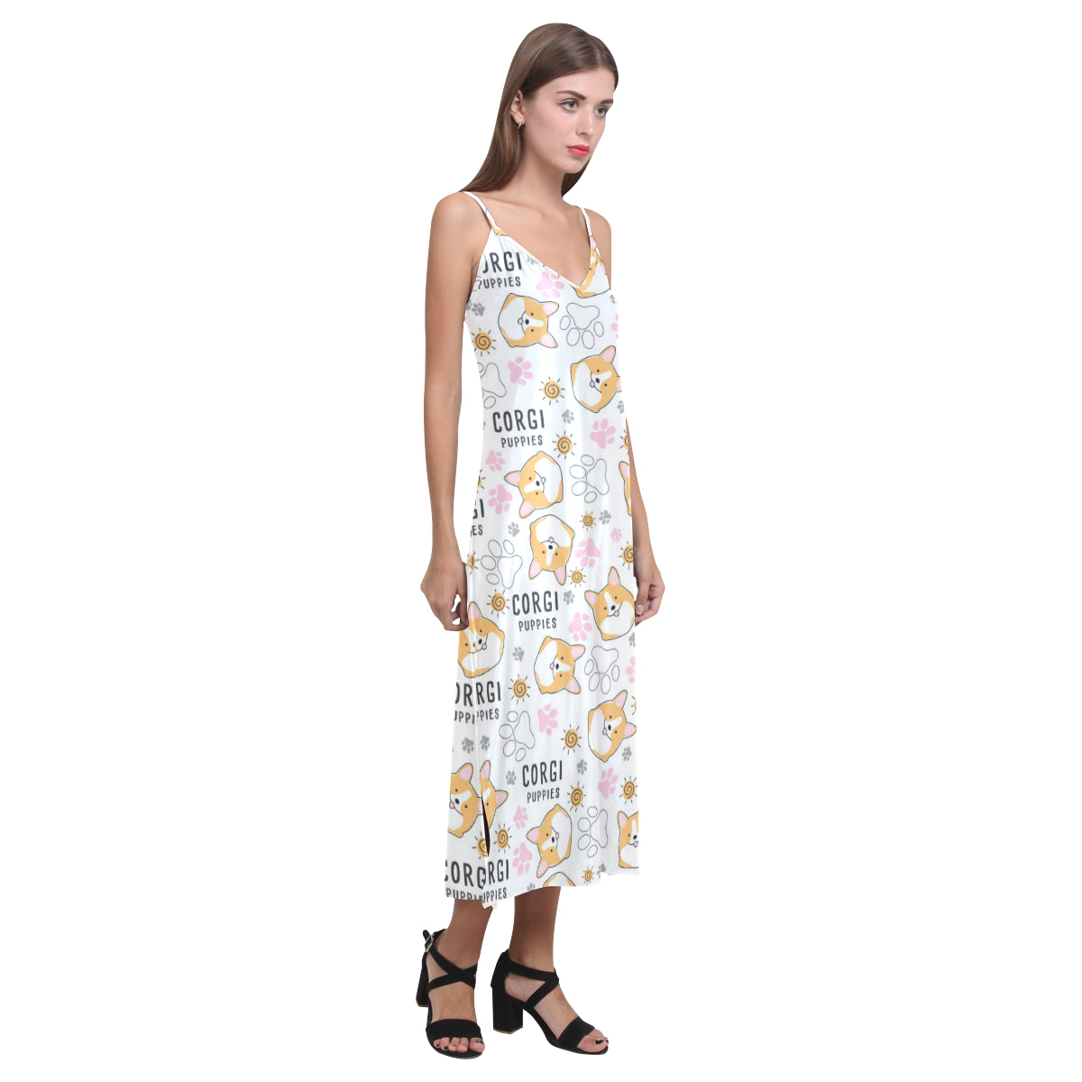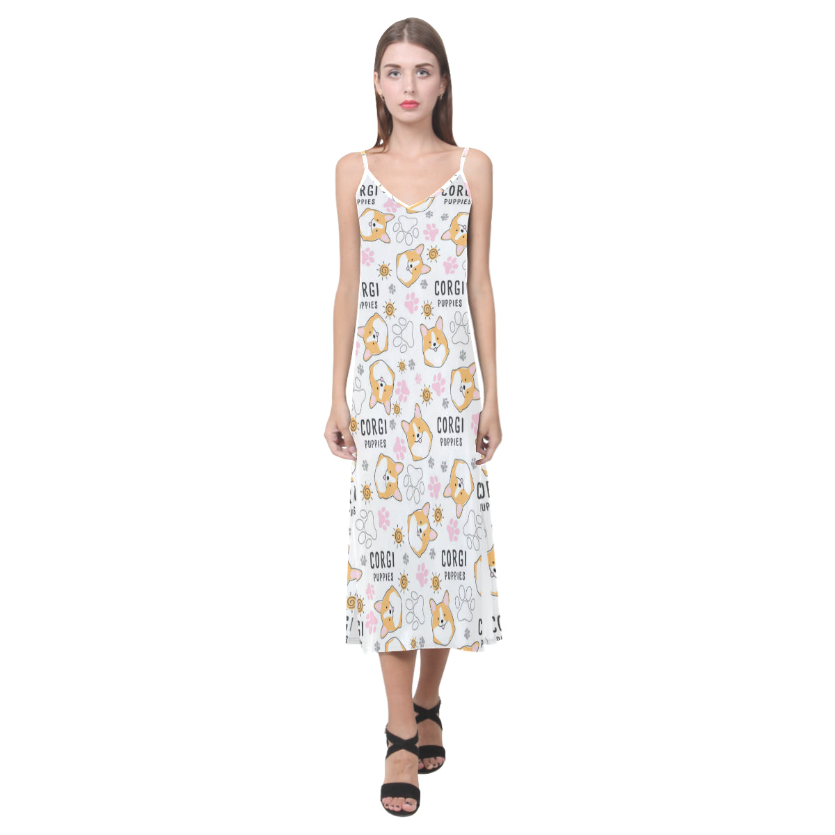 Corgi Dog Pattern V-Neck Open Fork Long Dress is a uniqued design and limited item. It made to order, hand printed, and sewn with love in our factory.