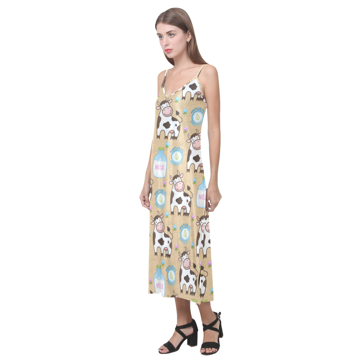Cow bottle of milk pattern V-Neck Open Fork Long Dress is a uniqued design and limited item. It made to order, hand printed, and sewn with love in our factory.