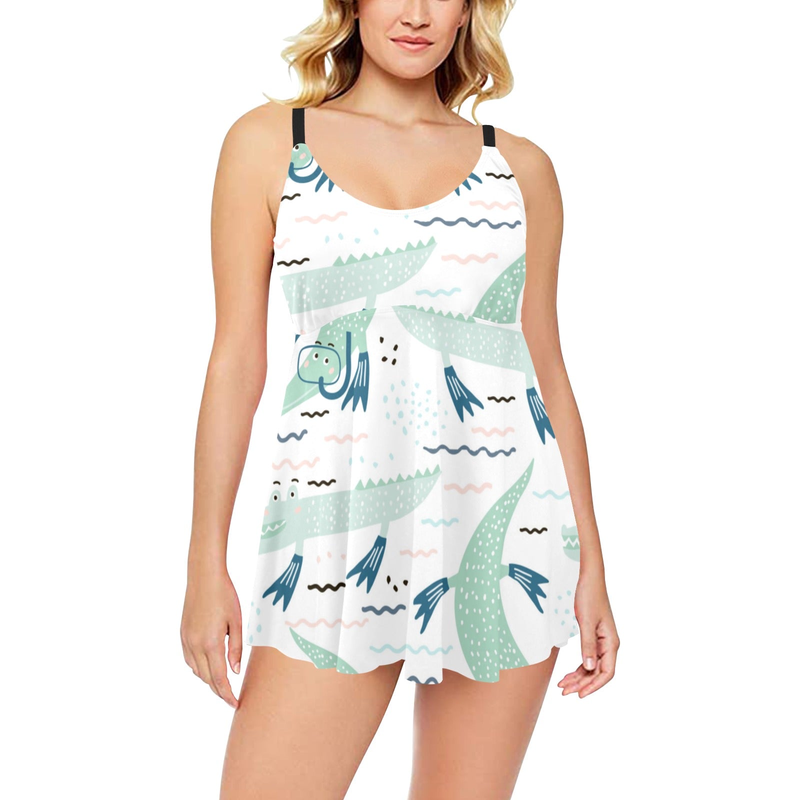 Crocodile diver pattern Chest Sexy Pleated Two Piece Swim Dress