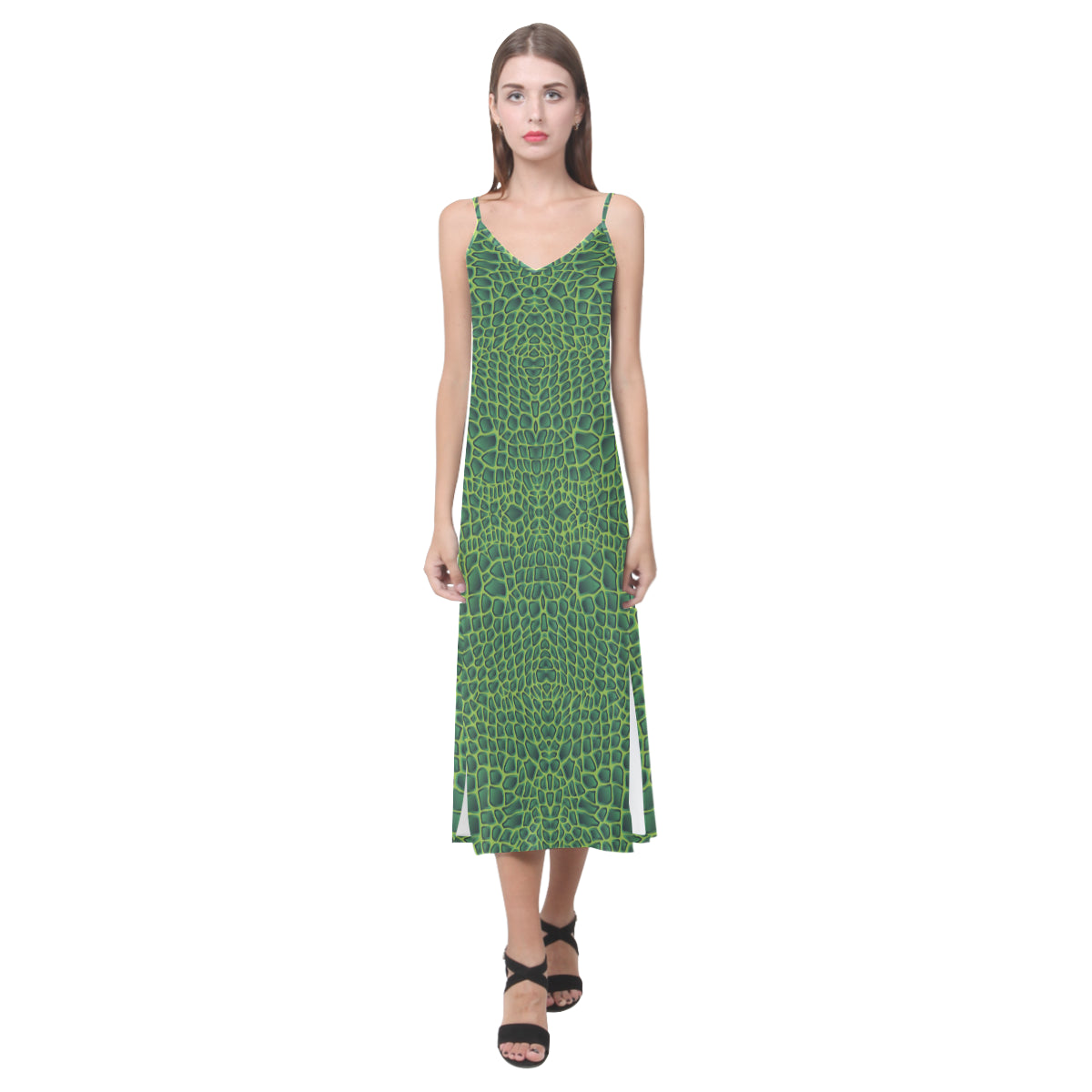 Crocodile Skin Printed V-Neck Open Fork Long Dress is a uniqued design and limited item. It made to order, hand printed, and sewn with love in our factory.