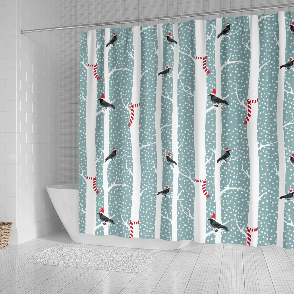 Crows christmas hat scarf Shower Curtain is a uniqued design and limited item. It made to order, hand printed, and sewn with love in our factory.