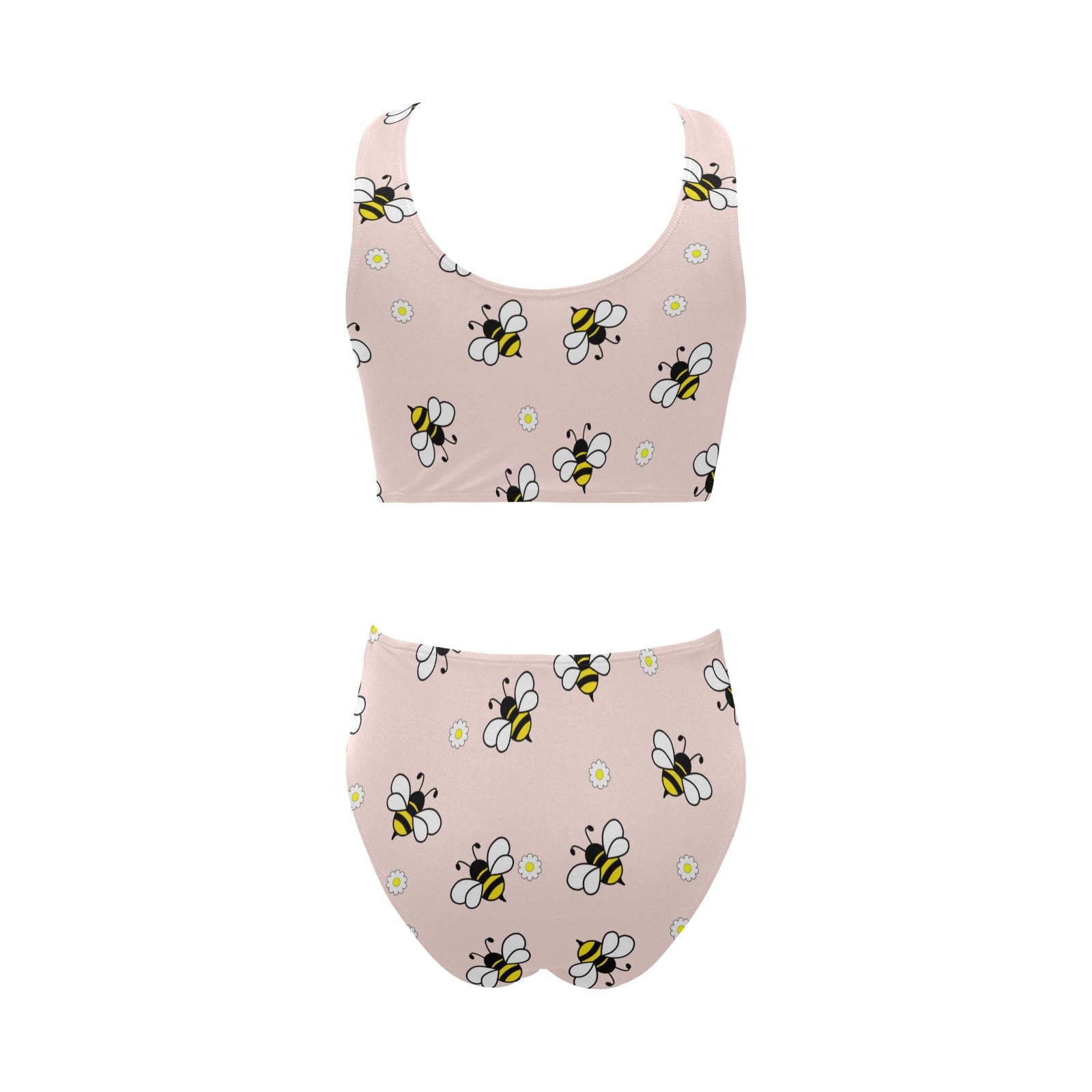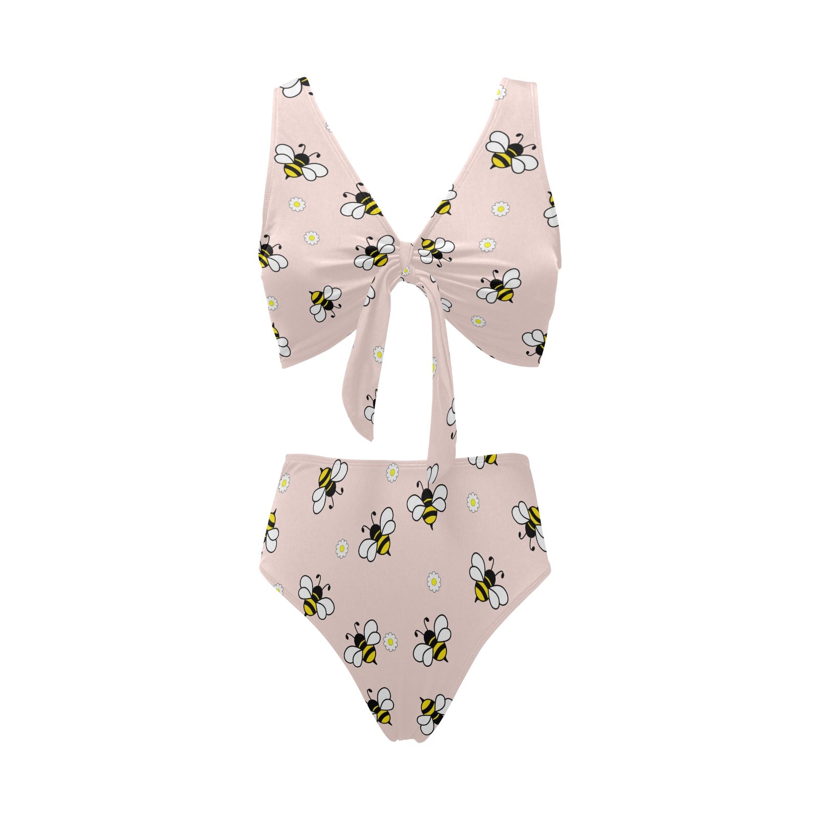 Cute bee flower pattern pink background Chest Bowknot High Waisted Bikini Swimsuit