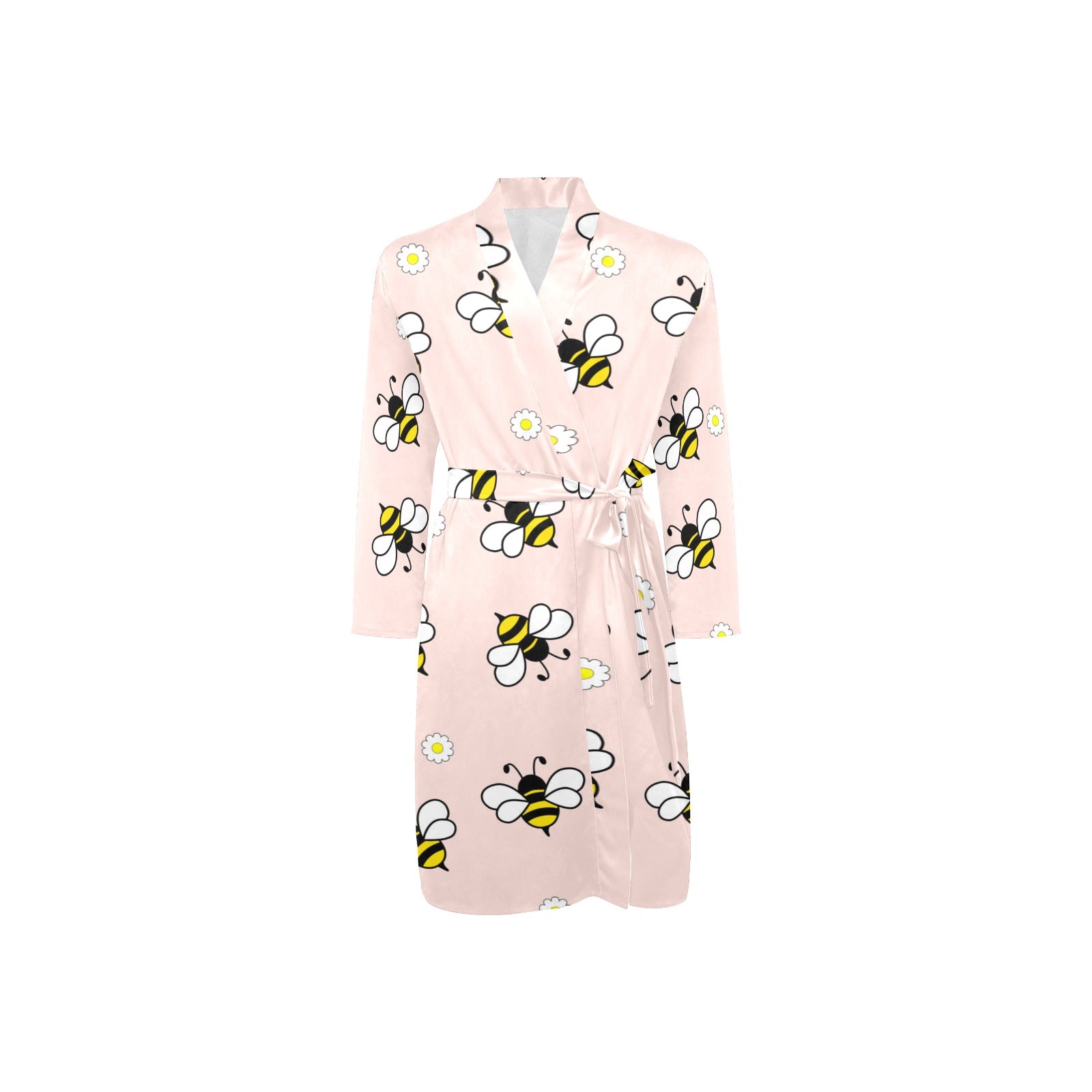 Cute bee flower pattern pink background Men's Long Sleeve Belted Night Robe