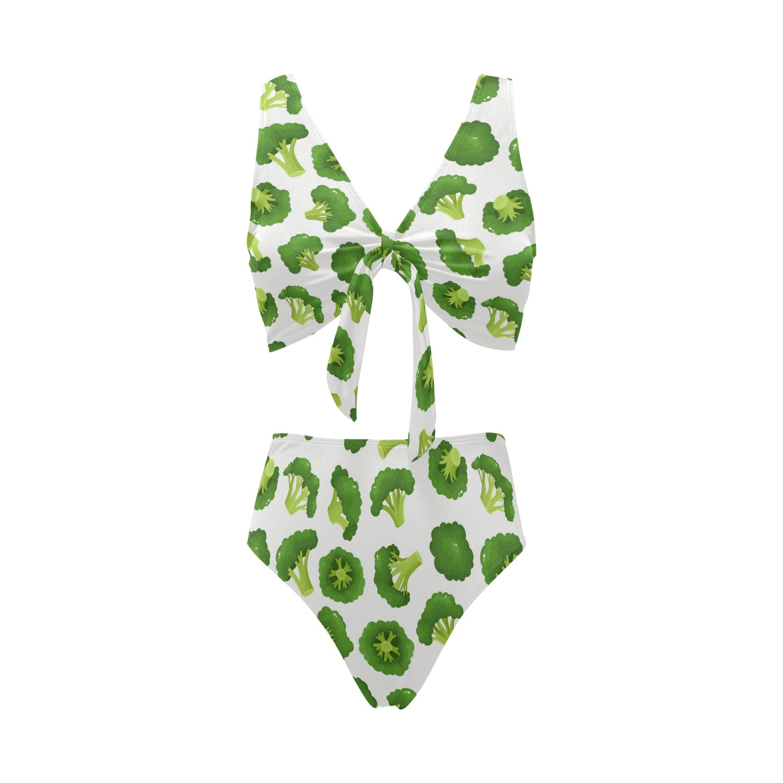 Cute broccoli pattern Chest Bowknot High Waisted Bikini Swimsuit