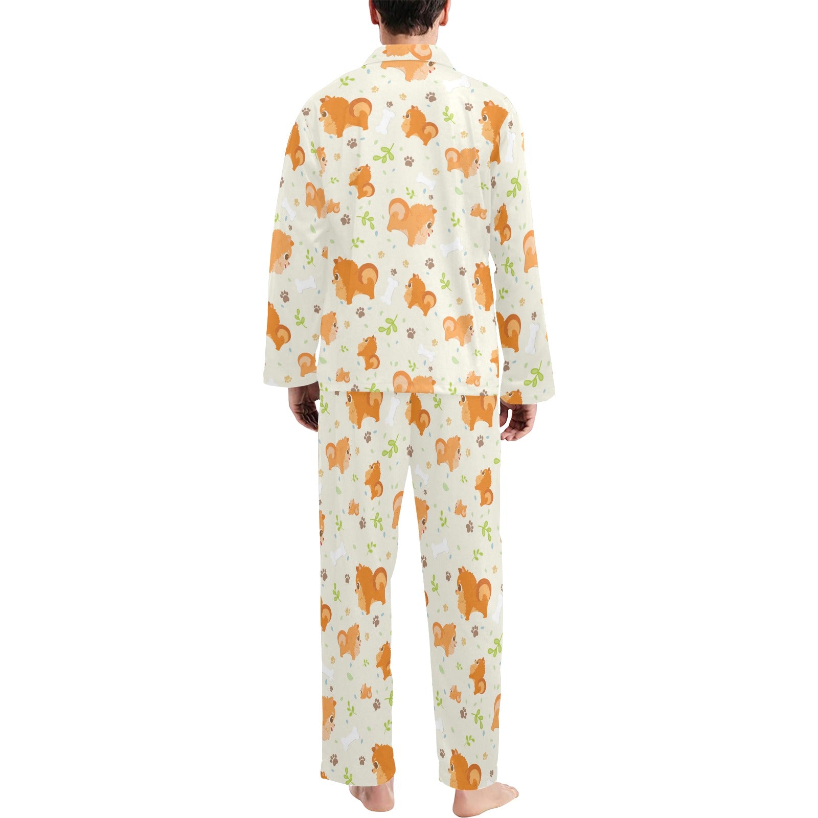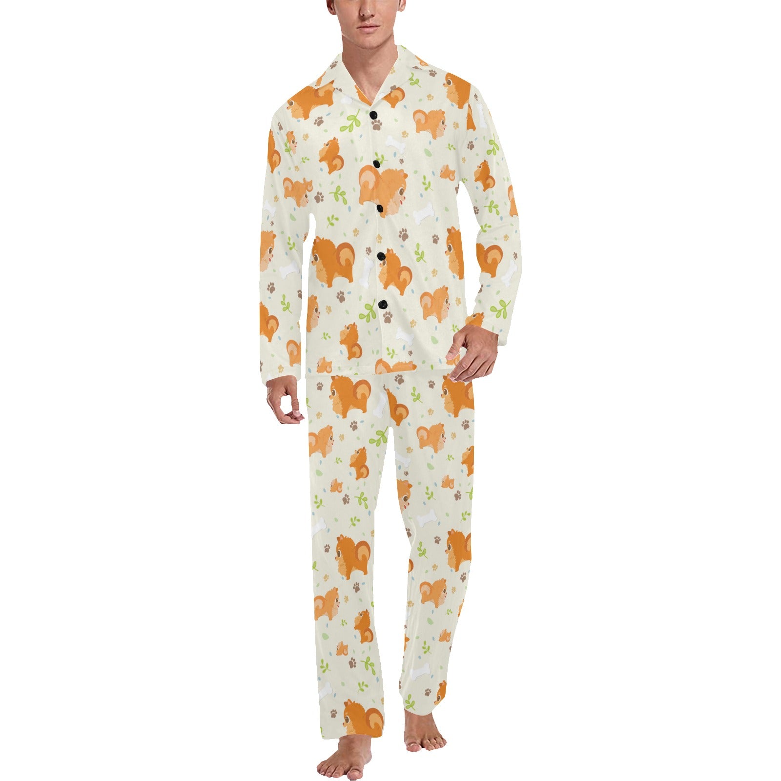 Cute brown pomeranian paw leave bone pattern Men's Long Pajama Set