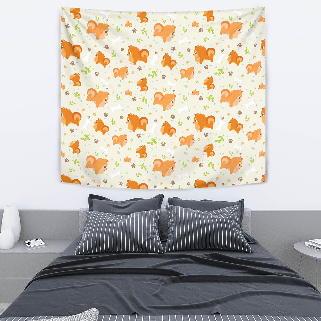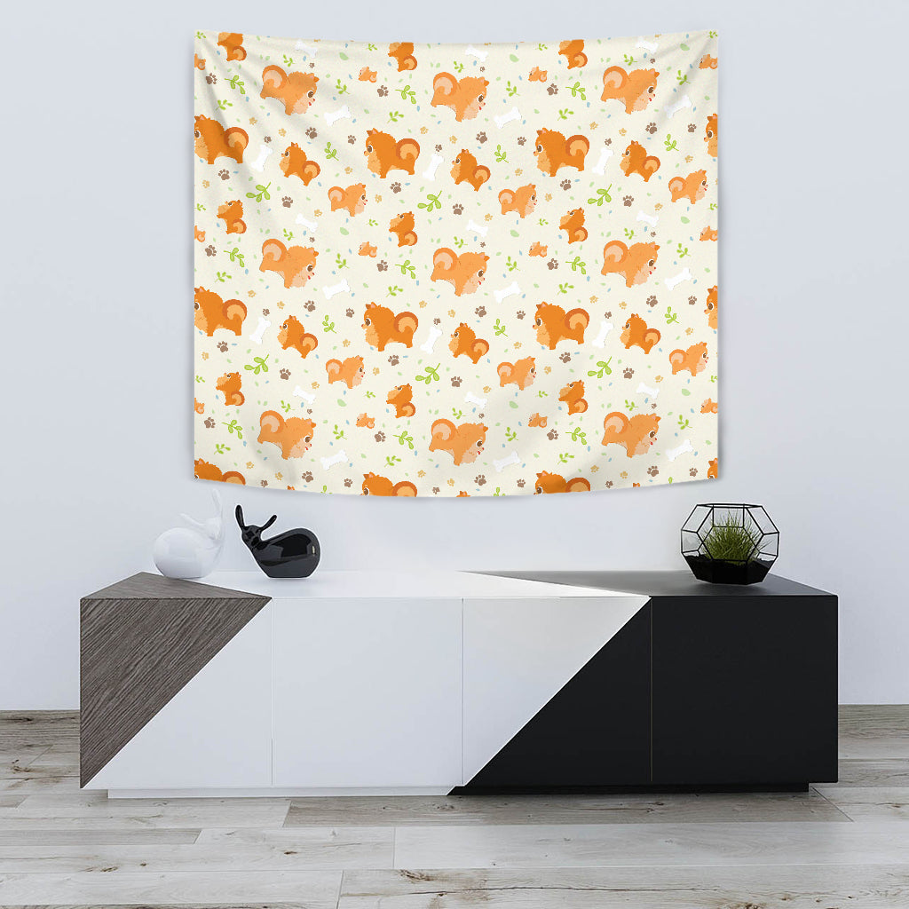 Cute Brown Pomeranian Paw Leave Bone Pattern Wall Tapestry