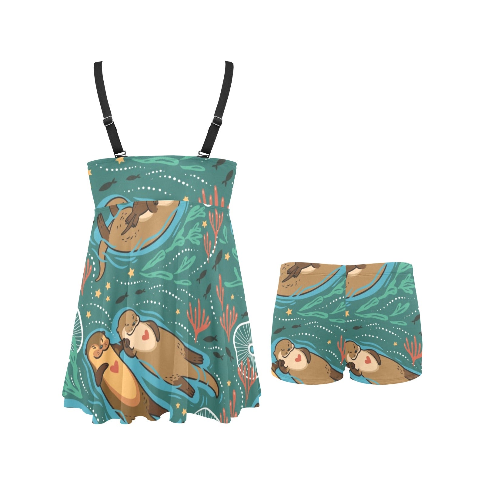 cute brown sea otters ornamental seaweed corals gr Chest Sexy Pleated Two Piece Swim Dress