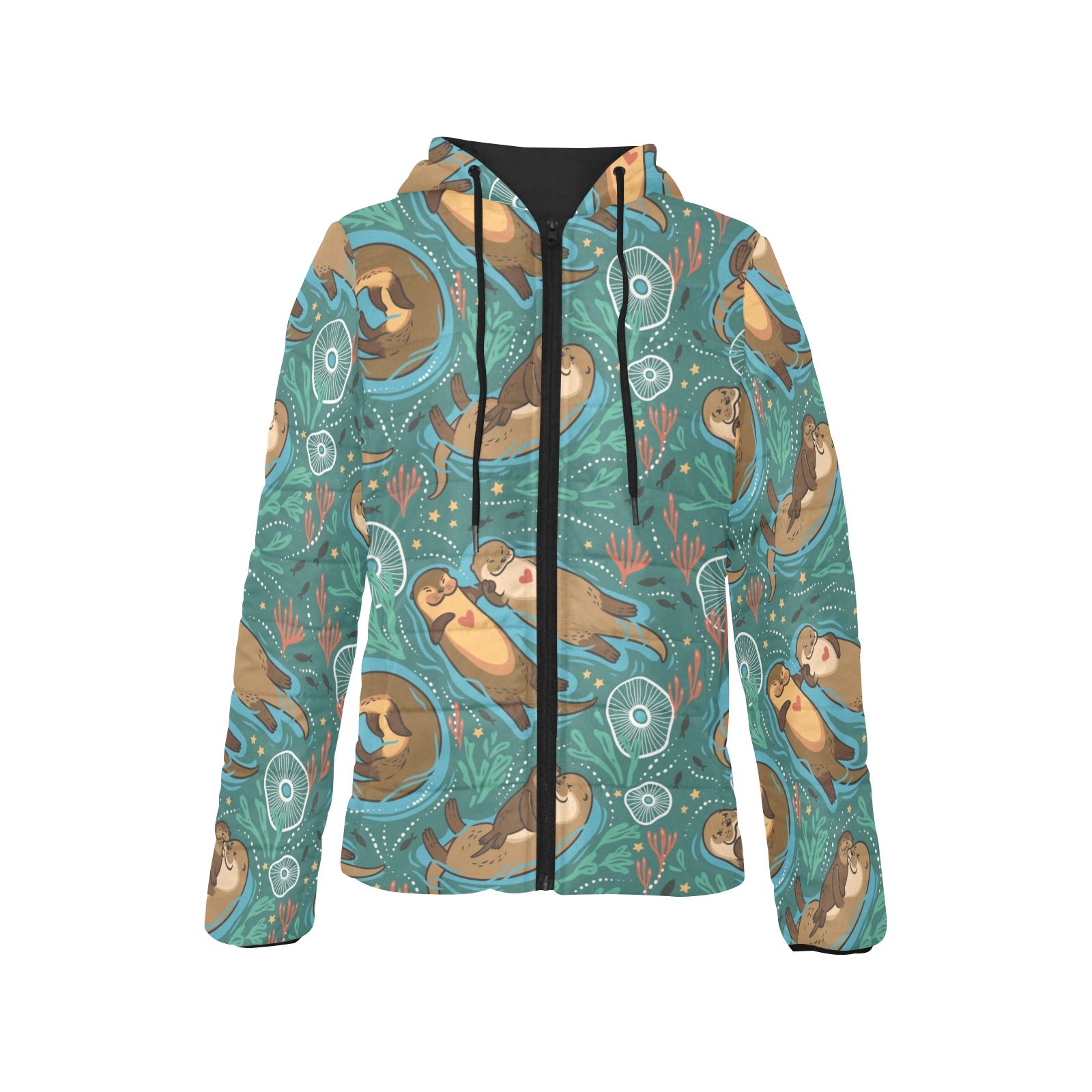 cute brown sea otters ornamental seaweed corals gr Women's Padded Hooded Jacket