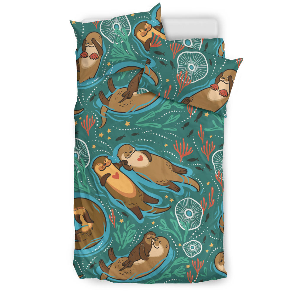 cute brown sea otters ornamental seaweed corals green water Bedding Set is a uniqued design and limited item. It made to order, hand printed, and sewn with love in our factory.