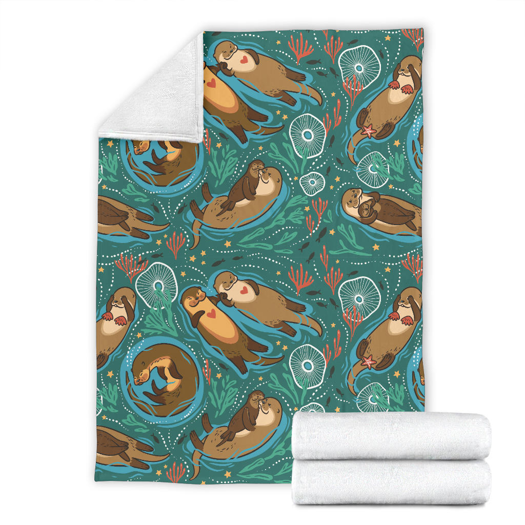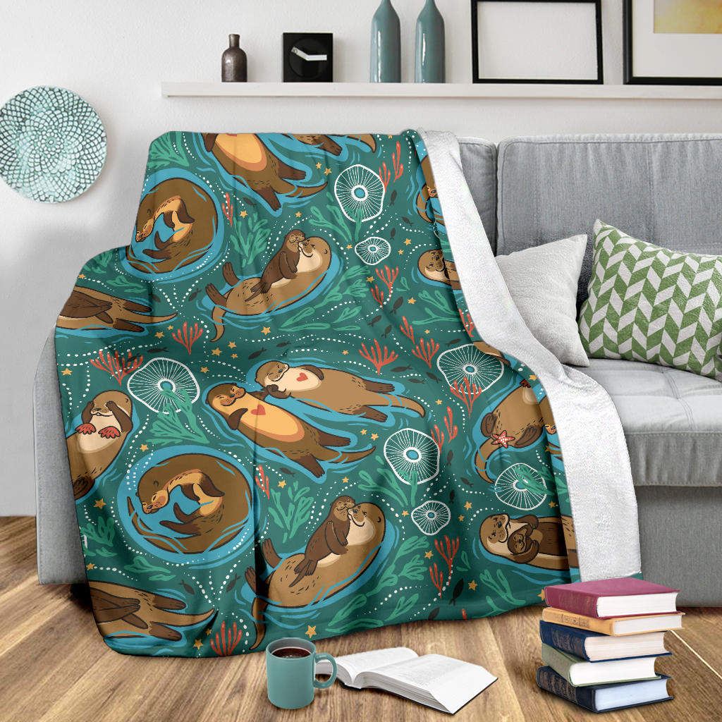 cute brown sea otters ornamental seaweed corals green water Premium Blanket is a uniqued design and limited item. It made to order, hand printed, and sewn with love in our factory.