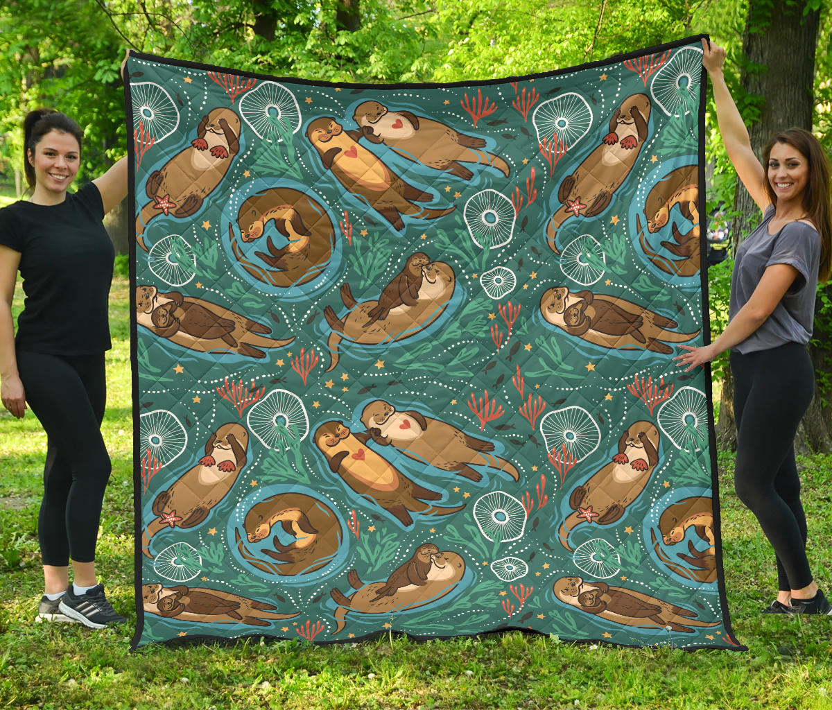 Cute Brown Sea Otters Ornamental Seaweed Corals Green Water Premium Quilt is a uniqued design and limited item. It made to order, hand printed, and sewn with love in our factory.