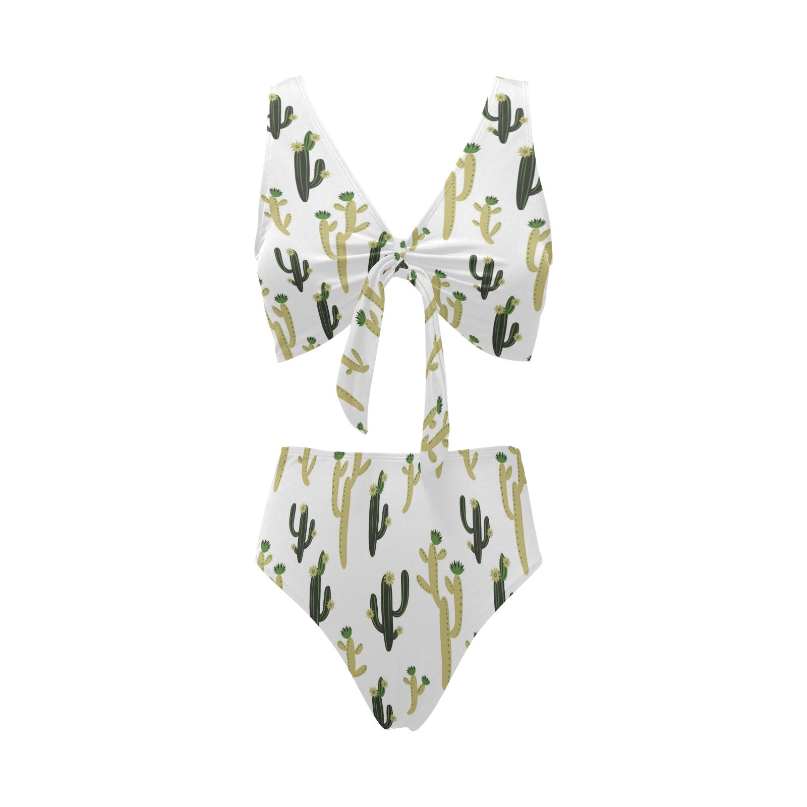 Cute cactus pattern Chest Bowknot High Waisted Bikini Swimsuit