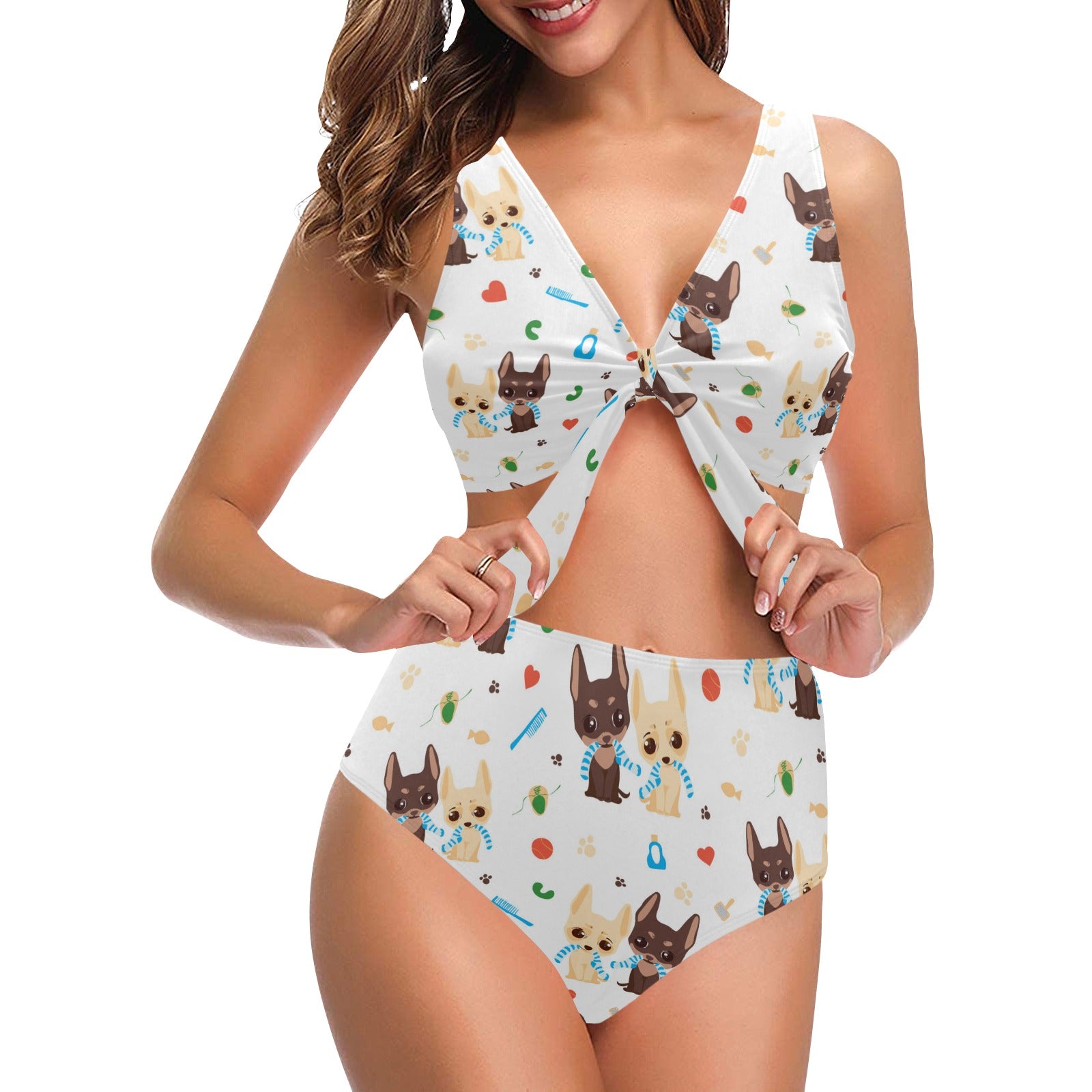 Cute Chihuahua dog pattern Chest Bowknot High Waisted Bikini Swimsuit
