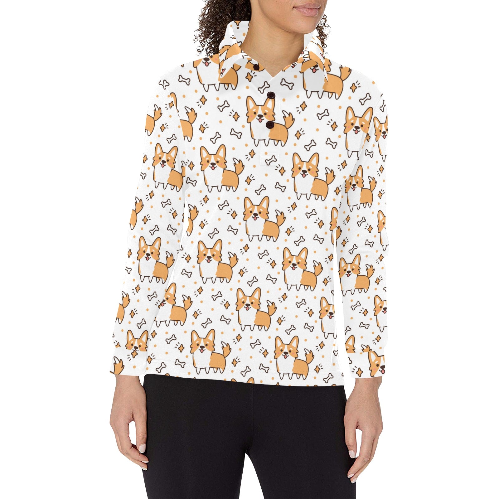 Cute corgi heart star bone pattern Women's Long Sleeve Polo Shirt