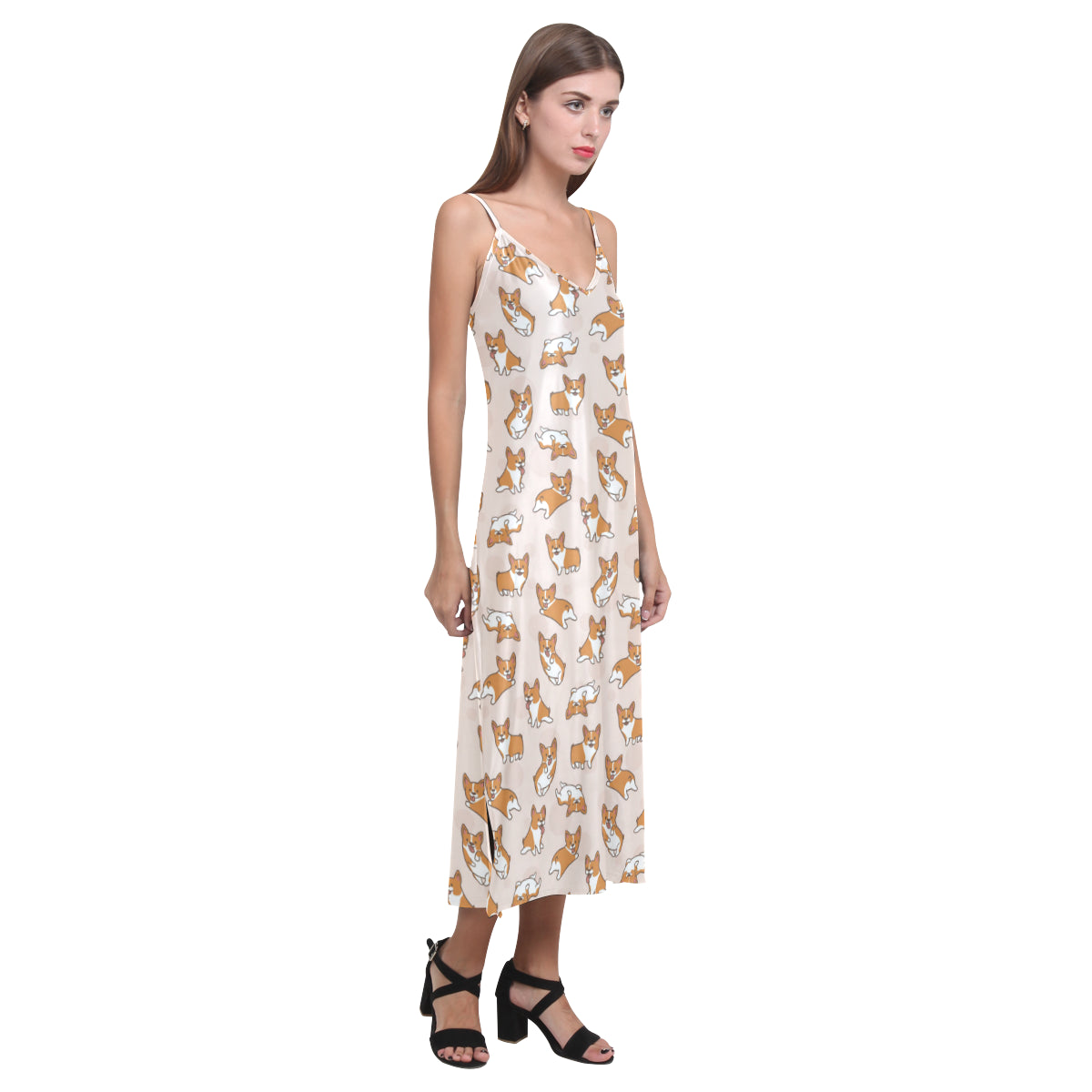 Cute Corgis Pattern pink background V-Neck Open Fork Long Dress is a uniqued design and limited item. It made to order, hand printed, and sewn with love in our factory.