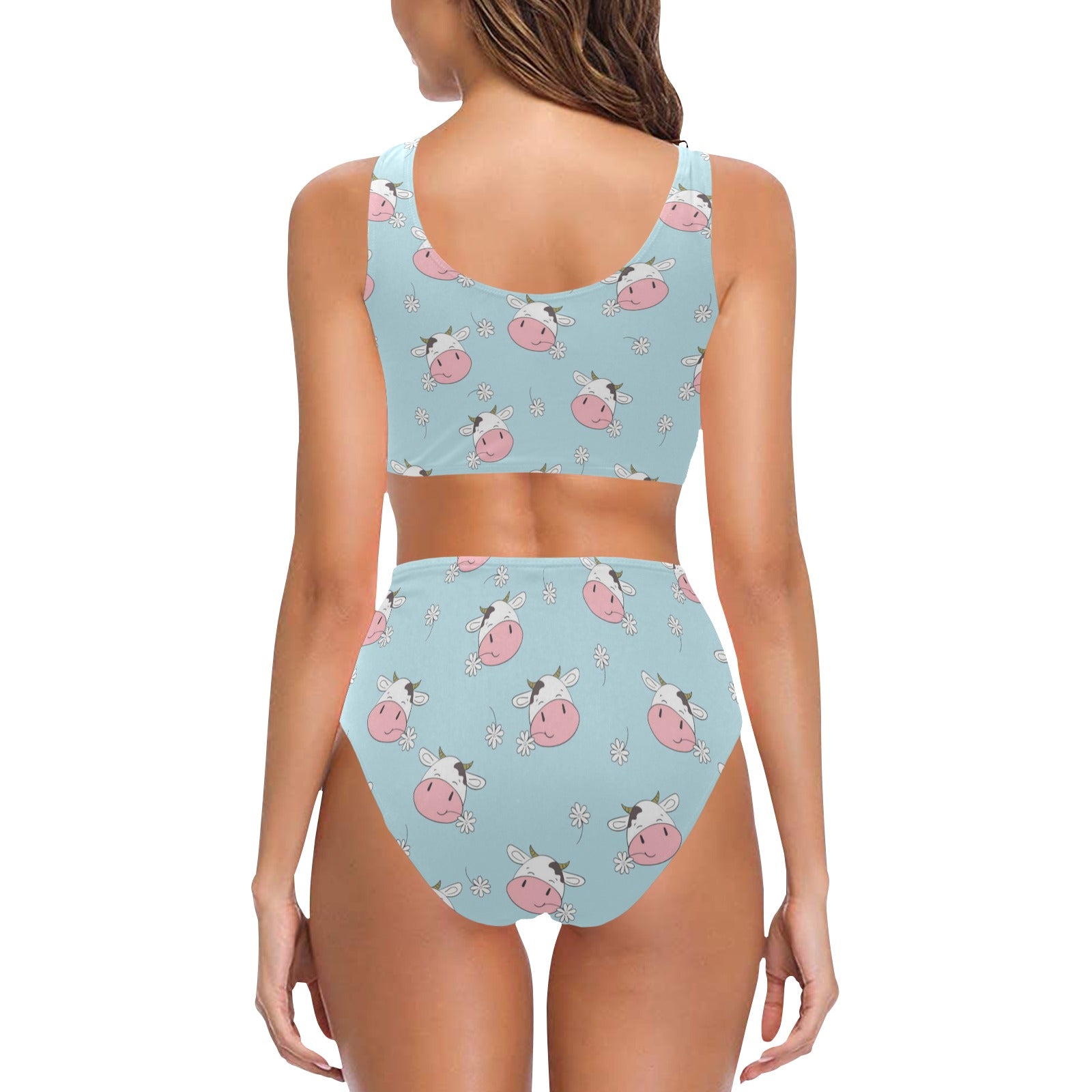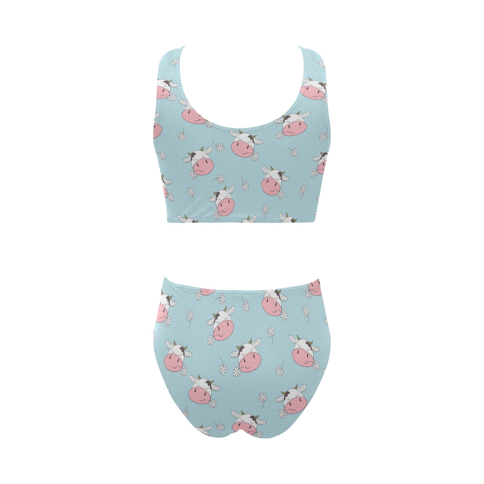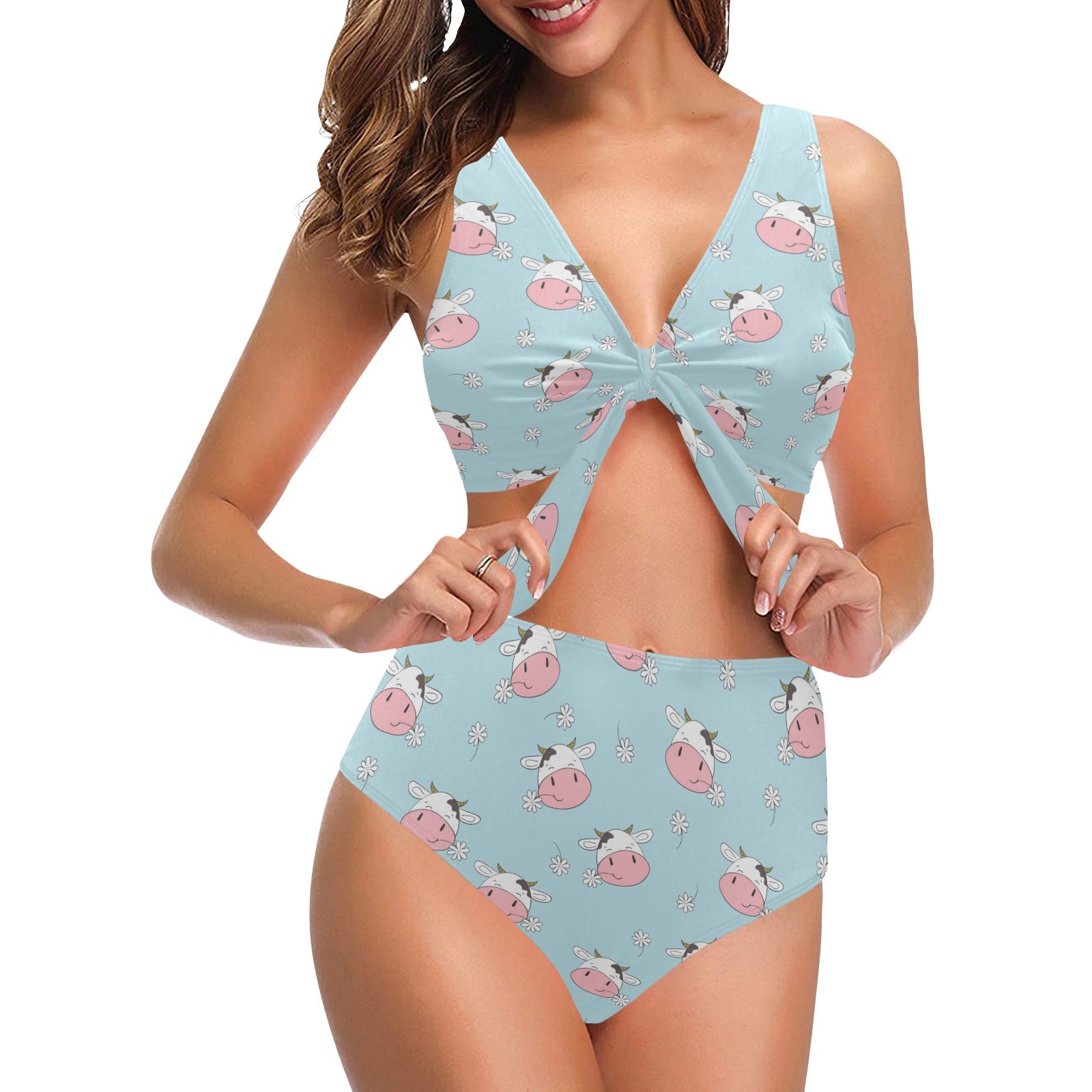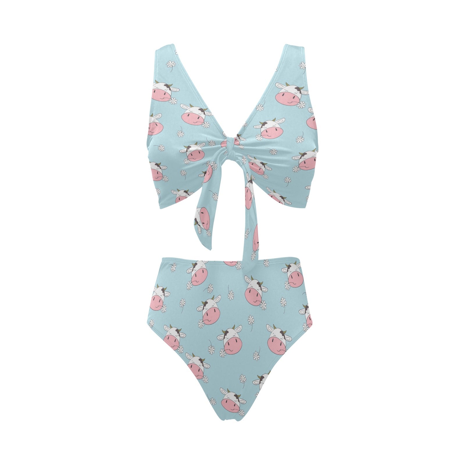 Cute cow flower pattern Chest Bowknot High Waisted Bikini Swimsuit