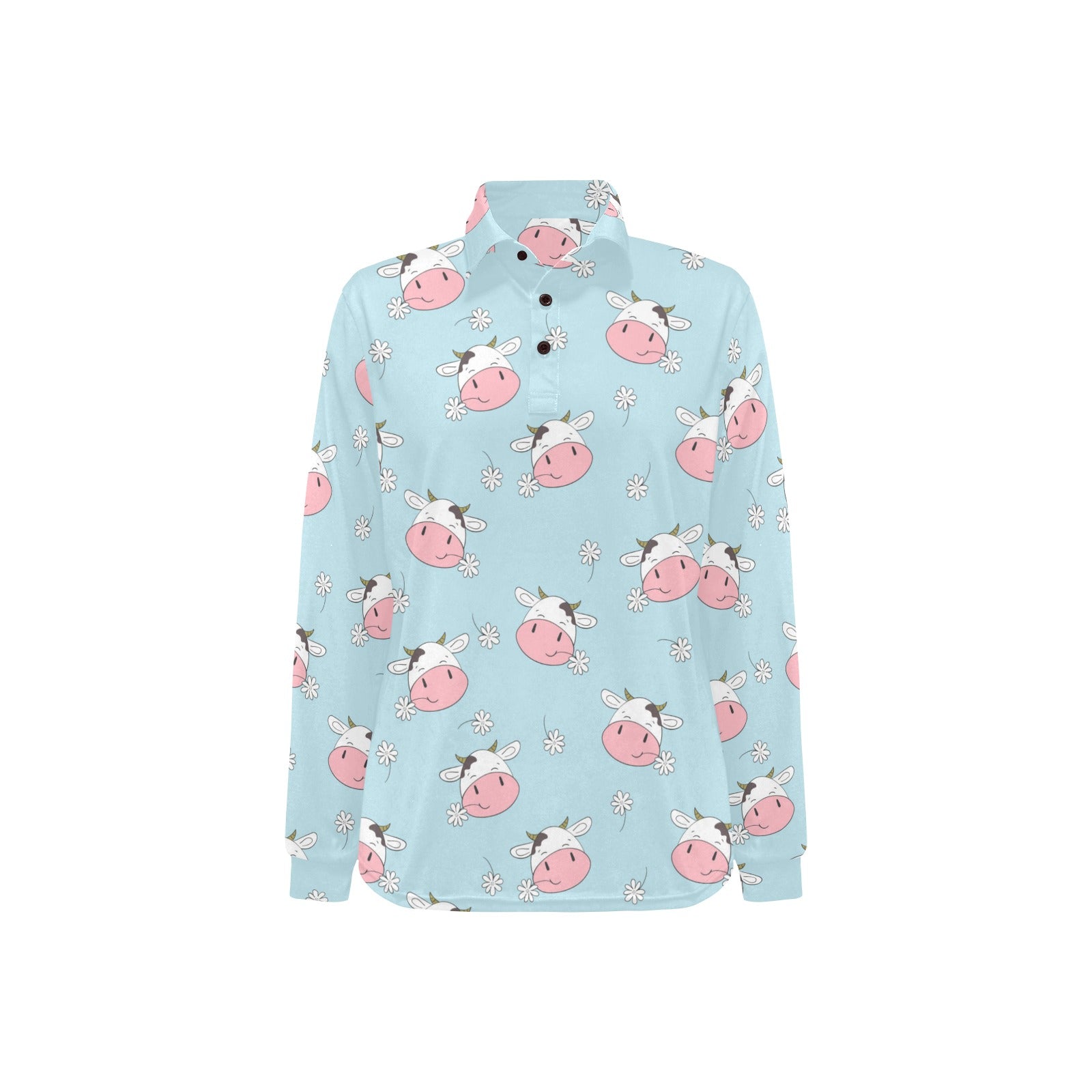 Cute cow flower pattern Women's Long Sleeve Polo Shirt